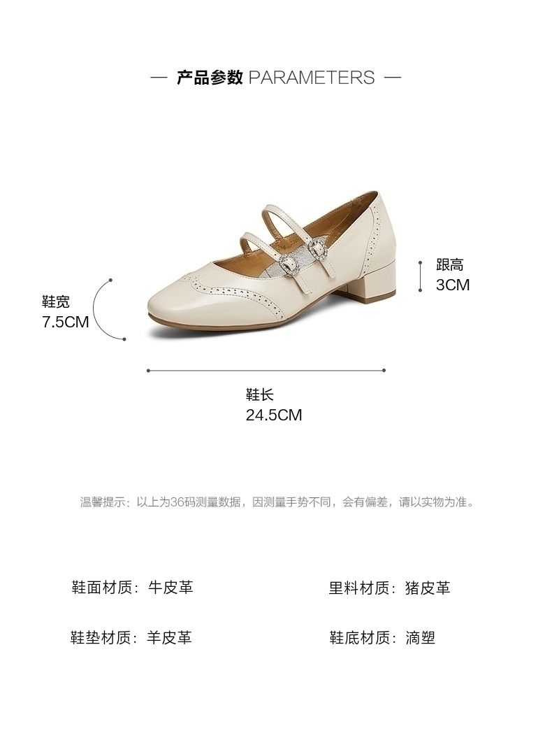 | 上市时间:2025年春季 | 生产/经销/进口厂家:丽荣鞋业(深圳)有限公司 | 鞋类流行款式:玛丽珍鞋 | 鞋头款式:圆头 | 执行标准:皮鞋 QB/T1002-2015 |
