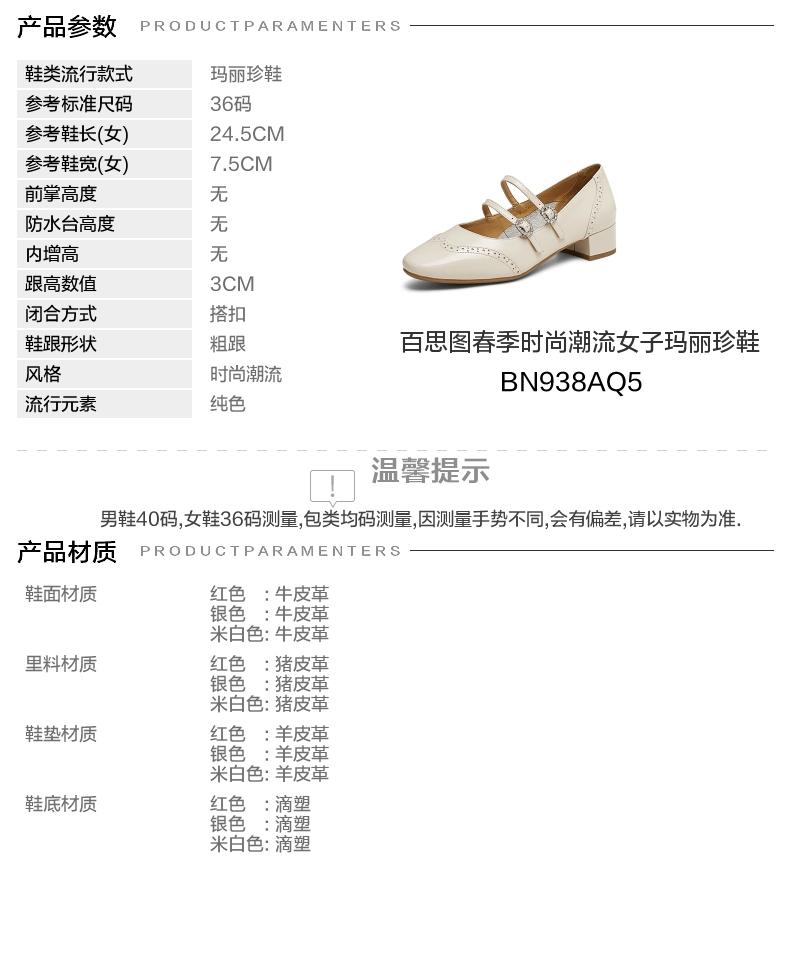 | 参考标准尺码:36码 | 跟高数值:3CM | 性别:女子 | 里料材质:猪皮革 | 制鞋工艺:胶贴皮鞋 |