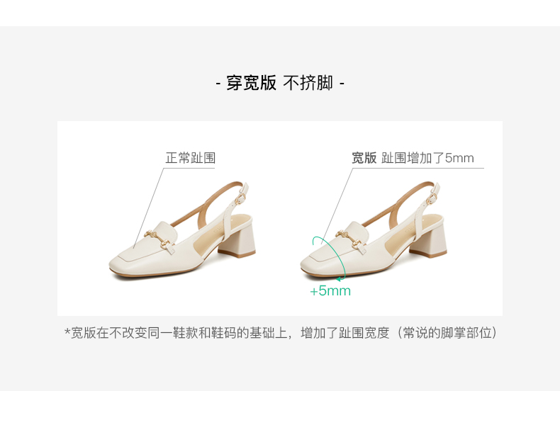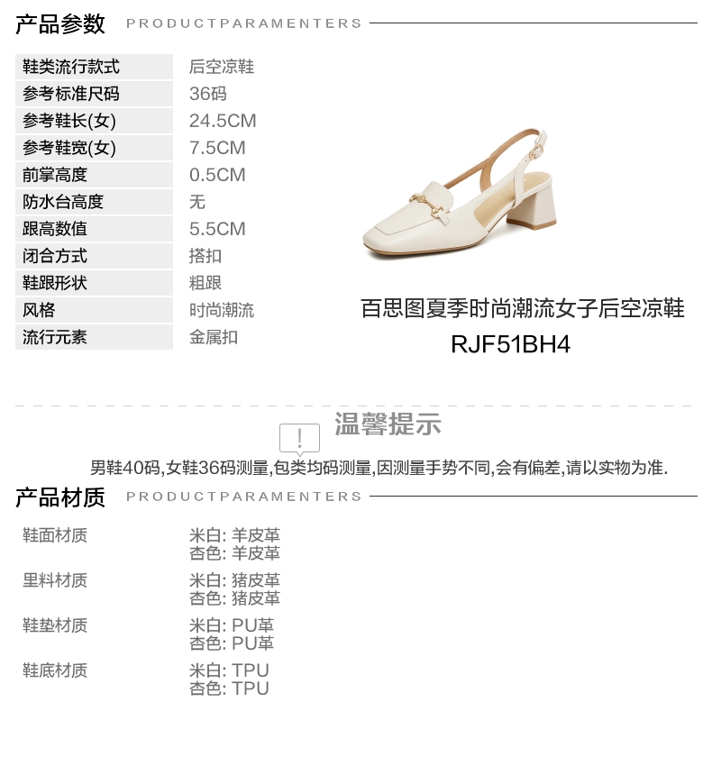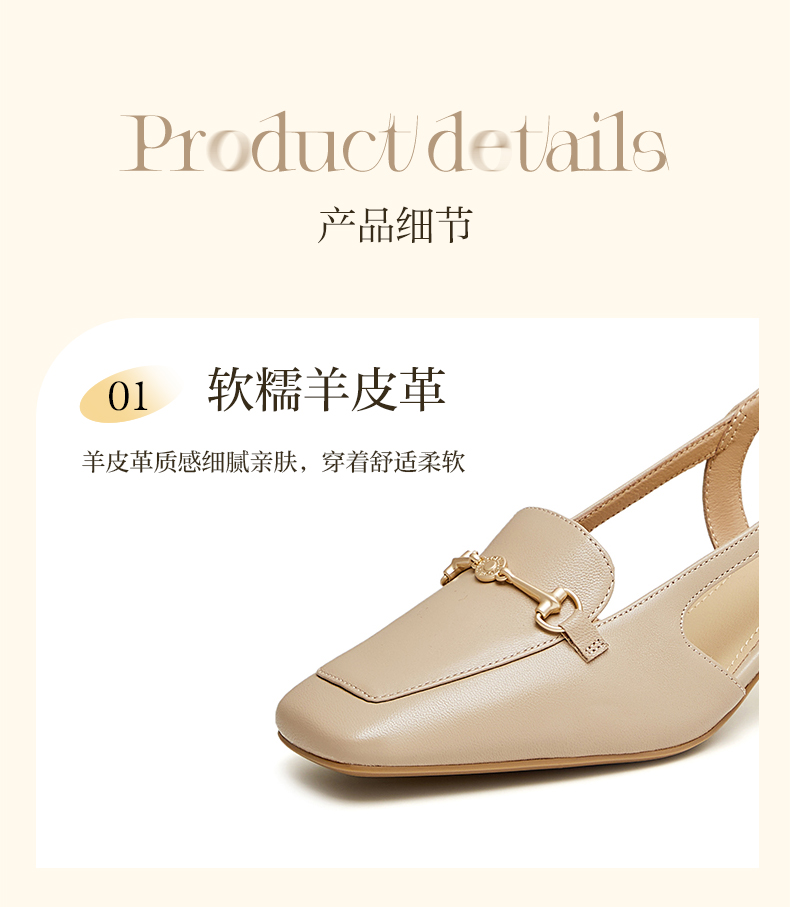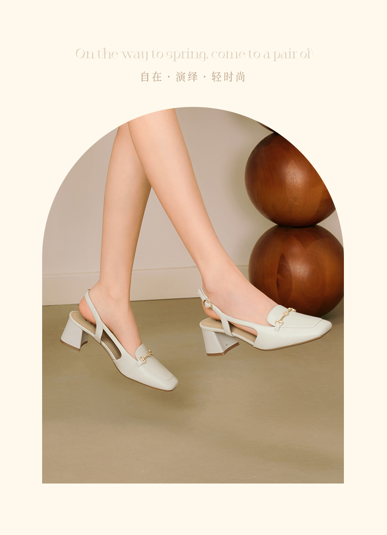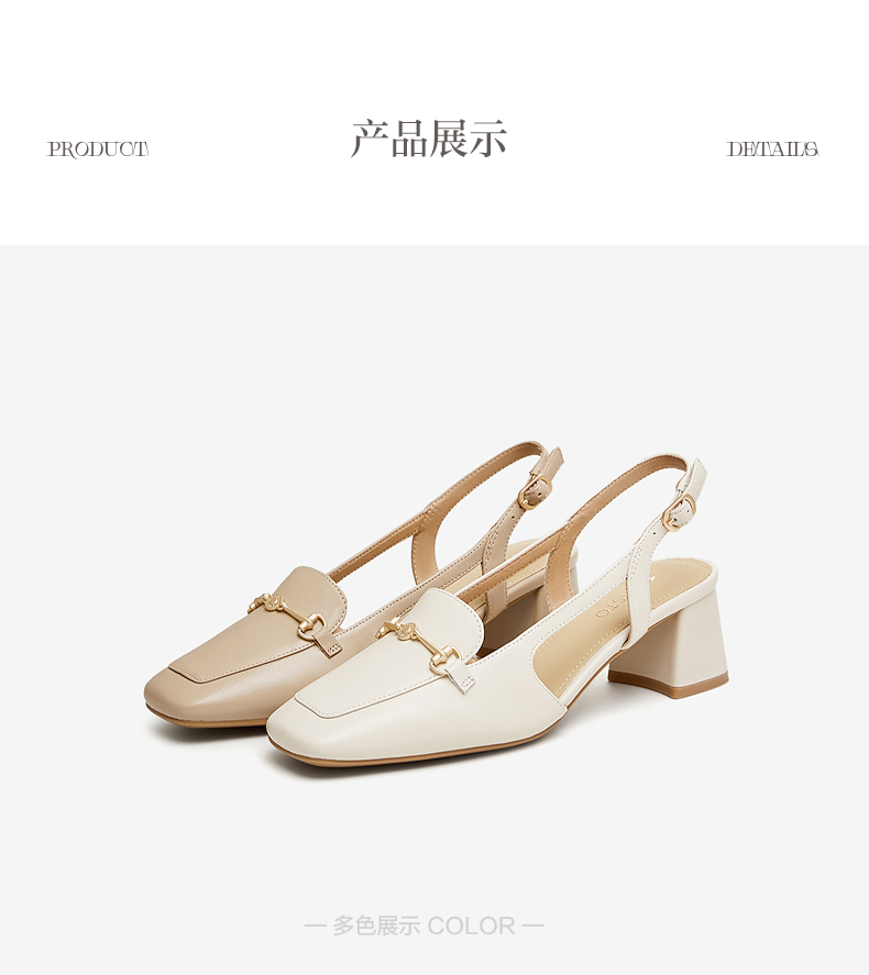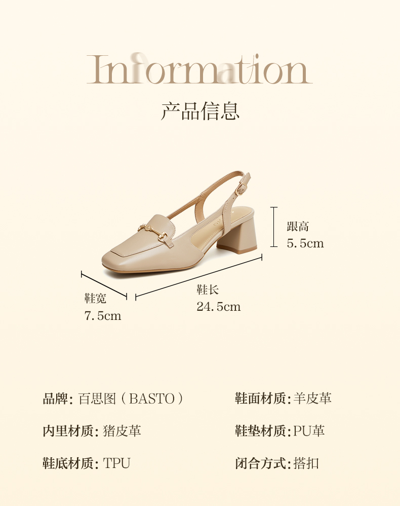 | 鞋类流行款式:后空凉鞋 | 鞋头款式:方头 | 执行标准:皮凉鞋GB/T22756-2017 | 跟高范围:中跟鞋(3-5CM) | 鞋面图案:纯色 |