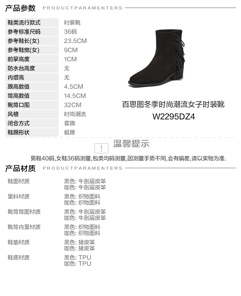 | 功能科技:防滑 | 鞋底材质:TPU | 靴筒内里材质:织物面料 | 内增高:无 | 鞋面材质:牛剖层皮革 |