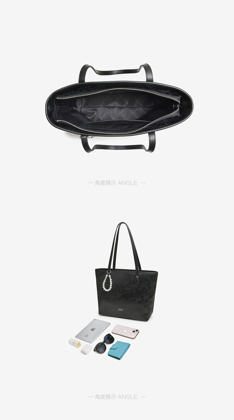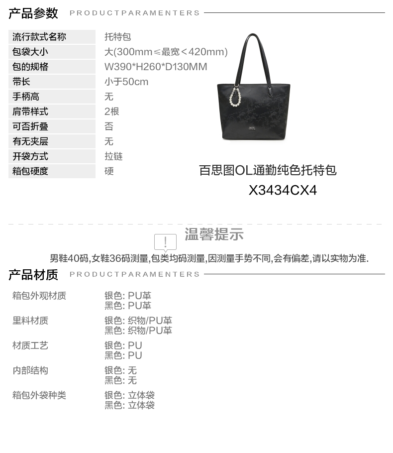 | 适用场景:通勤 | 流行款式名称:托特包 | 开袋方式:拉链 | 性别:女子 | 里料材质:织物/PU革 |