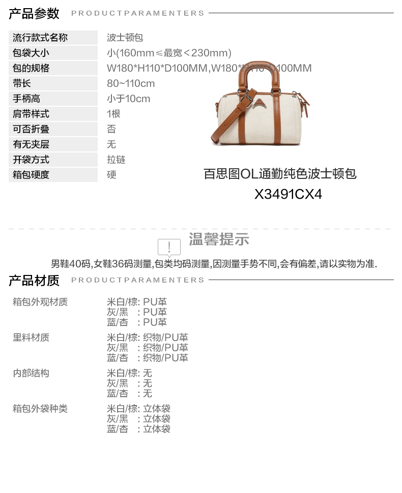 | 可否折叠:否 | 闭合方式:拉链 | 所在区域:电子商务 | 是否防水:否 | 风格分类:波士顿包 |