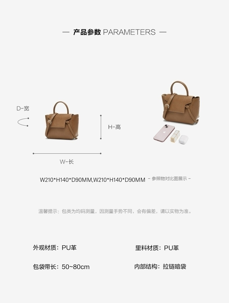 | 带长:50~80cm | 箱包外形:梯形 | 厂家地址:广东省深圳市 | 流行元素:纯色 | 包的规格:W210*H140*D90MM |