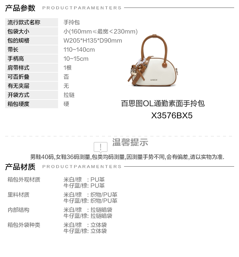 | 年份:2025年 | 色系:米白 | 适用场景:通勤 | 流行款式名称:手拎包 | 开袋方式:拉链 |