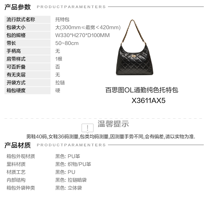 | 适用场景:通勤 | 流行款式名称:托特包 | 开袋方式:拉链 | 性别:女子 | 里料材质:织物/PU革 |