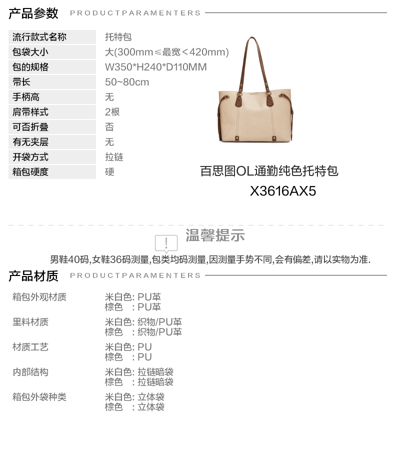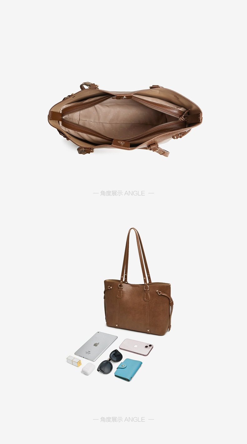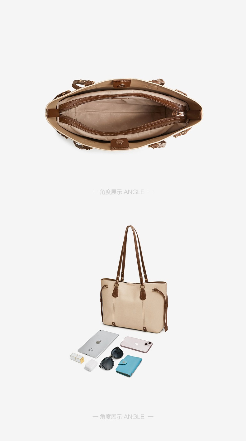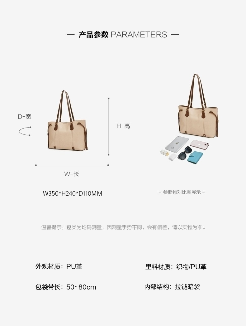 | 适用场景:通勤 | 流行款式名称:托特包 | 开袋方式:拉链 | 性别:女子 | 里料材质:织物/PU革 |