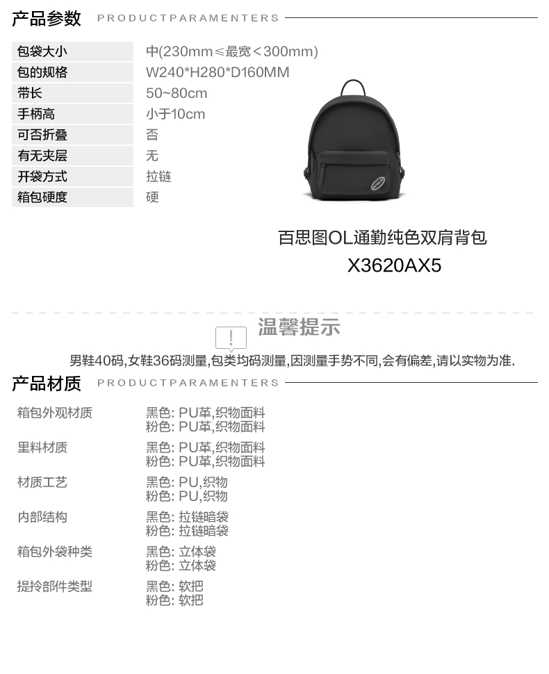 | 流行款式名称:双肩背包 | 开袋方式:拉链 | 性别:女 | 里料材质:织物面料PU革 | 手柄高:小于10cm |
