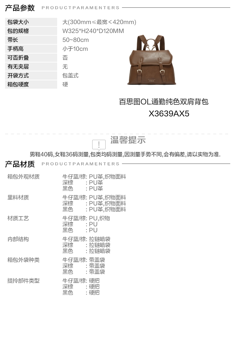 | 里料材质:PU革织物面料 | 款式季节:春季 | 材质工艺:PU | 皮质特征:PU | 箱包外观材质:PU革 |
