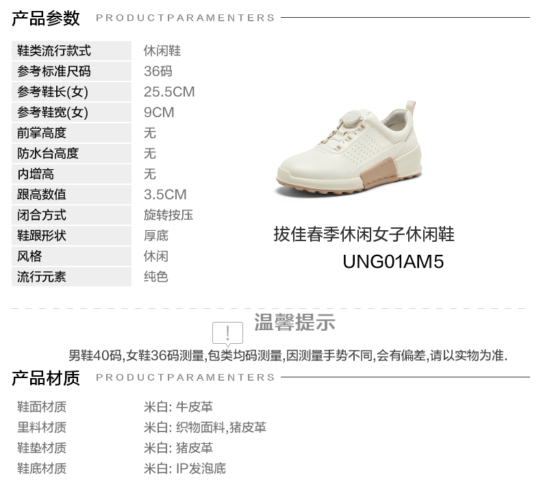 | 年份:2025年 | 色系:米白 | 参考标准尺码:36码 | 跟高数值:3.5CM | 性别:女子 |