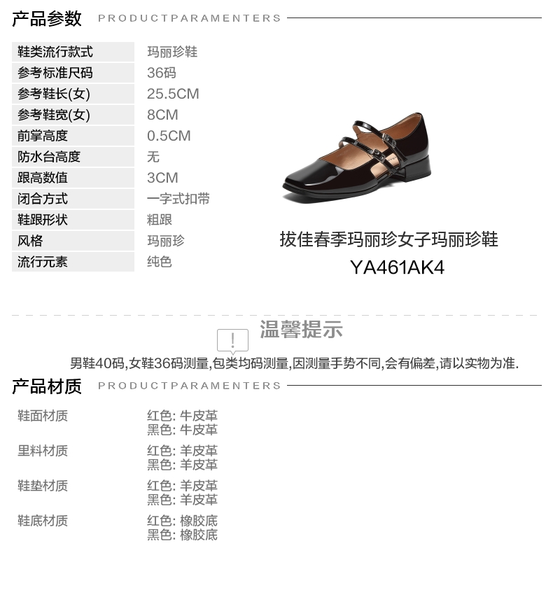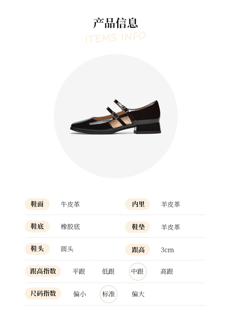 | 参考鞋长(女):25.5CM25.5CM | 参考鞋宽(女):8CM8CM | 风格:玛丽珍玛丽珍 | 年份:2024年2024年 | 色系:黑色黑色 |