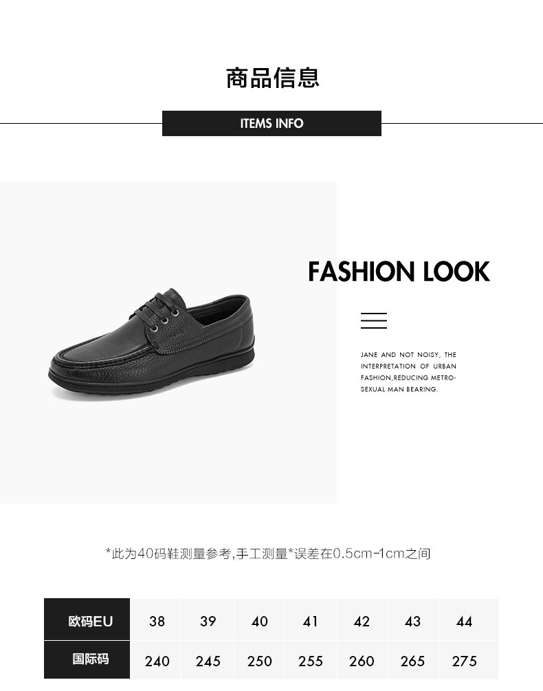 | 色系:黑色 | 跟高数值:2.5CM | 40码鞋宽参考(男):10CM | 性别:男子 | 里料材质:猪皮革织物面料 |