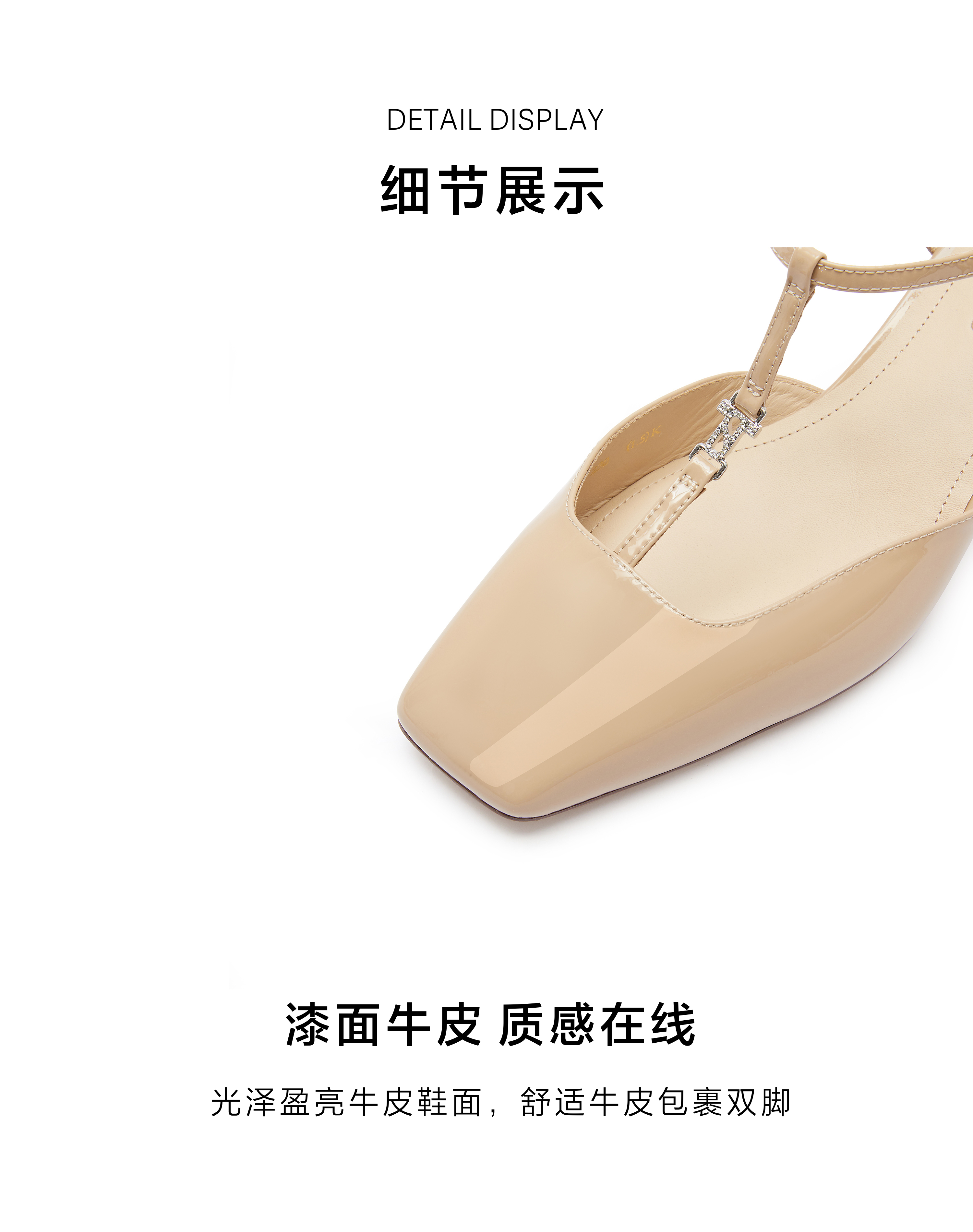| 渠道划分:线下同步 | 前掌高度:0.5CM | 皮质特征:漆皮牛皮革 | 销售季:2024年春季 |