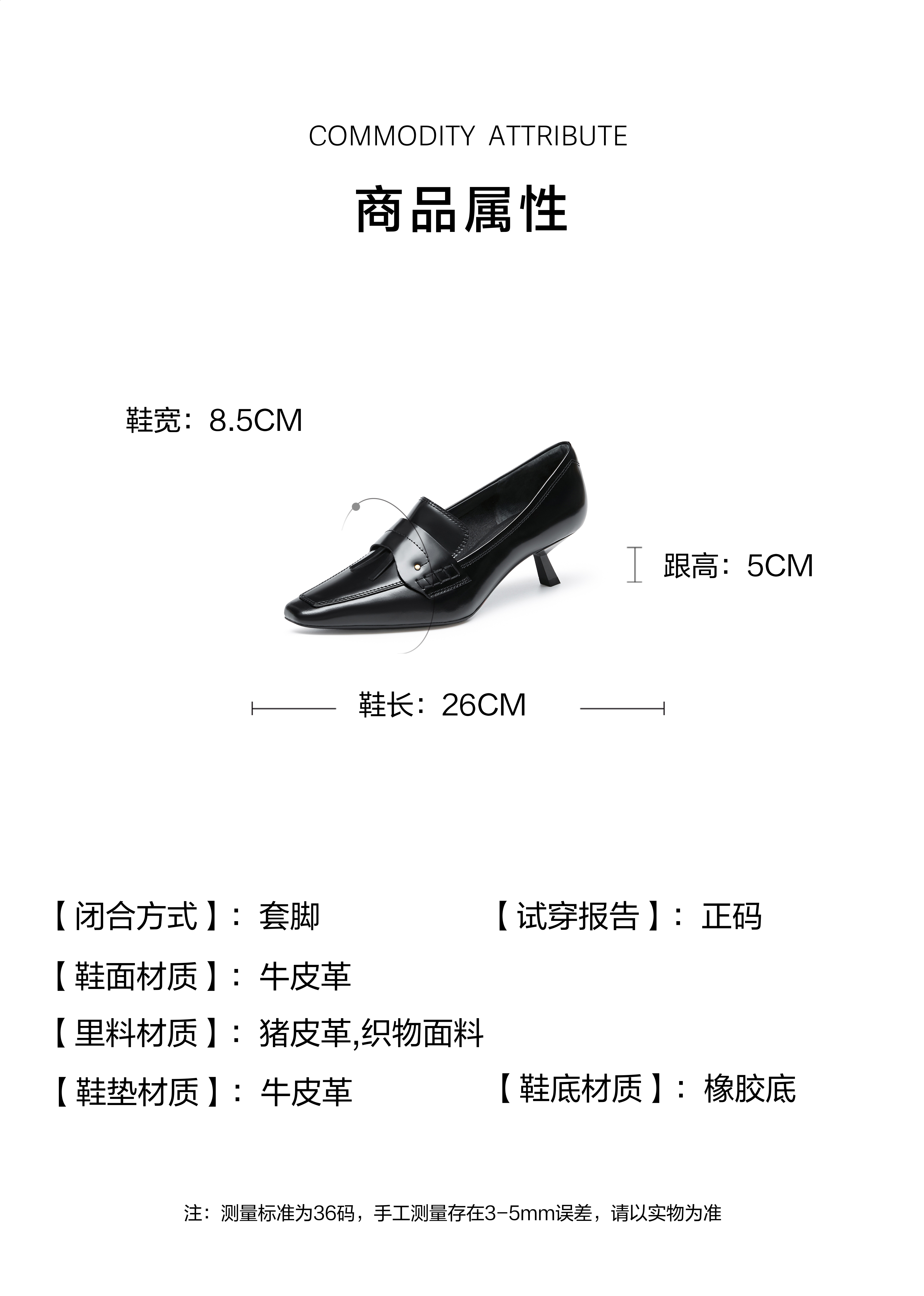 | 执行标准:皮鞋 QB/T1002-2015 | 跟高范围:中跟鞋(3-5CM) | 鞋面图案:纯色 | 鞋跟形状:细跟 | 厂家地址:广东省深圳市 |