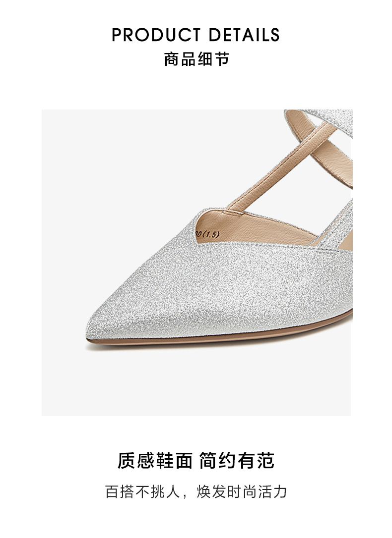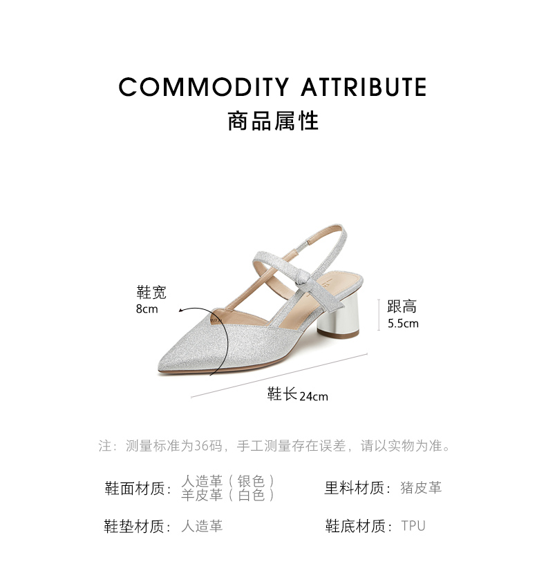 | 年份:2024年 | 色系:银色 | 参考标准尺码:36码 | 跟高数值:5.5CM | 性别:女子 |