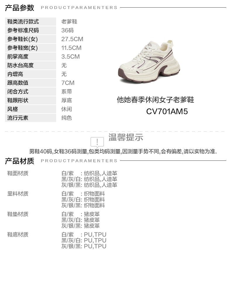 | 风格分类:老爹鞋 | 上市时间:2025年春季 | 生产/经销/进口厂家:丽荣鞋业(深圳)有限公司 | 鞋类流行款式:老爹鞋 | 鞋头款式:圆头 |