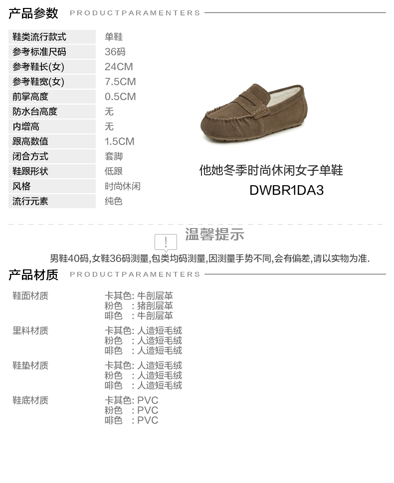 | 色系:卡其 | 跟高数值:1.5CM | 性别:女子 | 里料材质:人造短毛绒 | 制鞋工艺:胶贴皮鞋 |