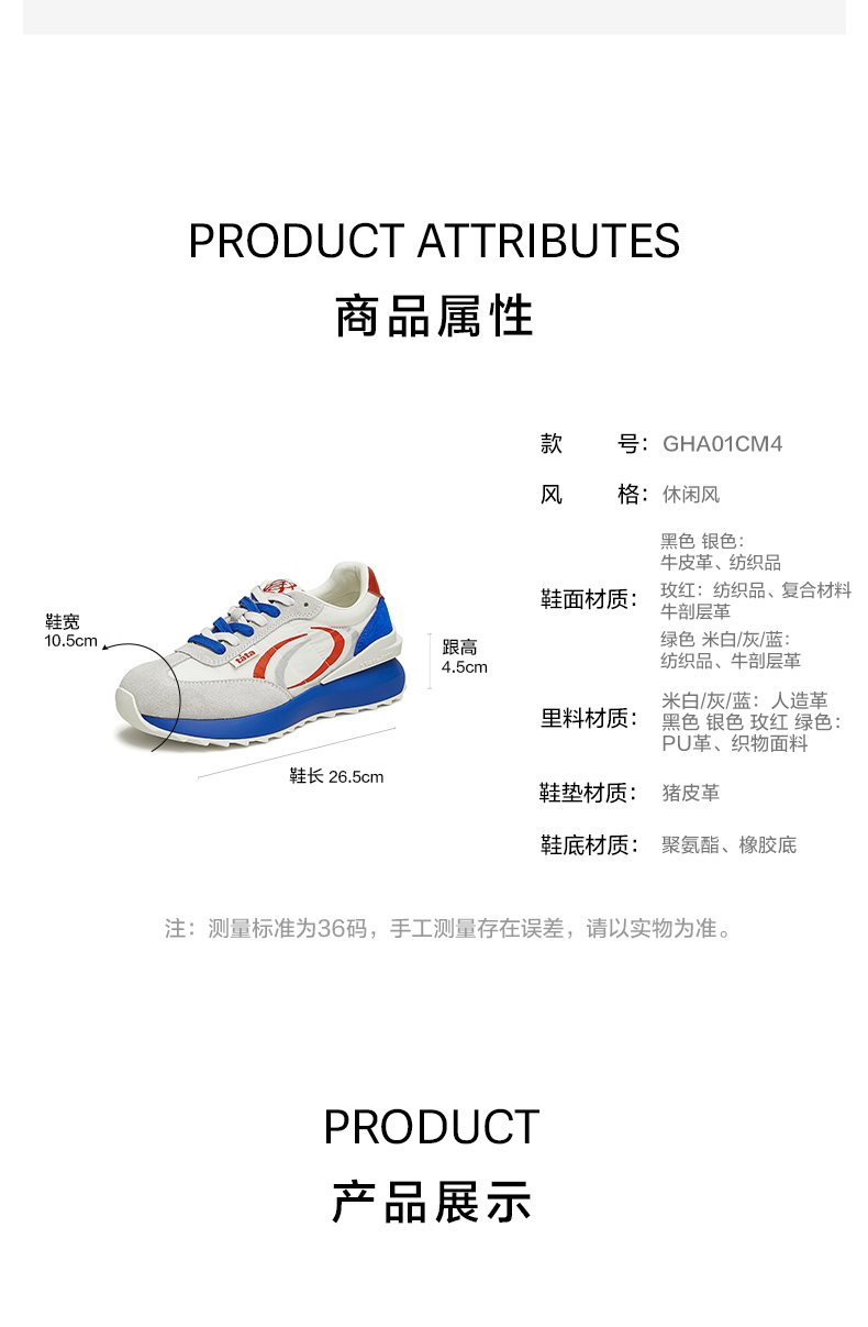 | 鞋帮:低帮 | 鞋底材质:橡胶底聚氨酯 | 内增高:无 | 鞋面材质:纺织品牛剖层革 | 适用场合:日常休闲 |
