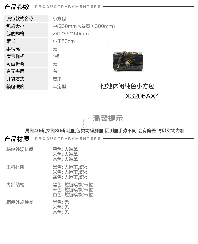 | 色系:杏色 | 集团旧货: | 适用场景:休闲 | 流行款式名称:小方包 | 开袋方式:磁扣 |