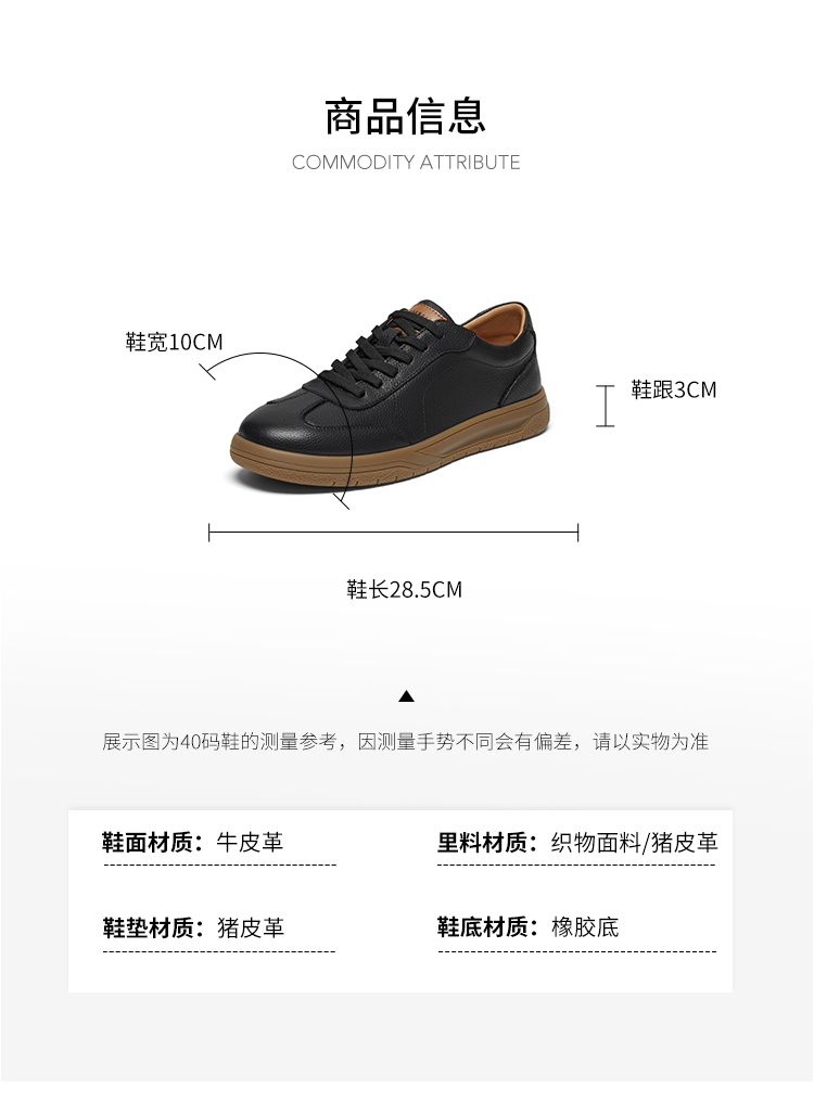 | 40码鞋长参考(男):28.5CM | 鞋帮:低帮 | 功能科技:耐磨 | 鞋底材质:橡胶底 | 鞋面材质:牛皮革 |