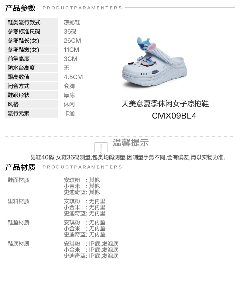 | 参考标准尺码:36码 | 跟高数值:4.5CM | 性别:女子 | 里料材质:无内里 | 制鞋工艺:车线胶粘 |