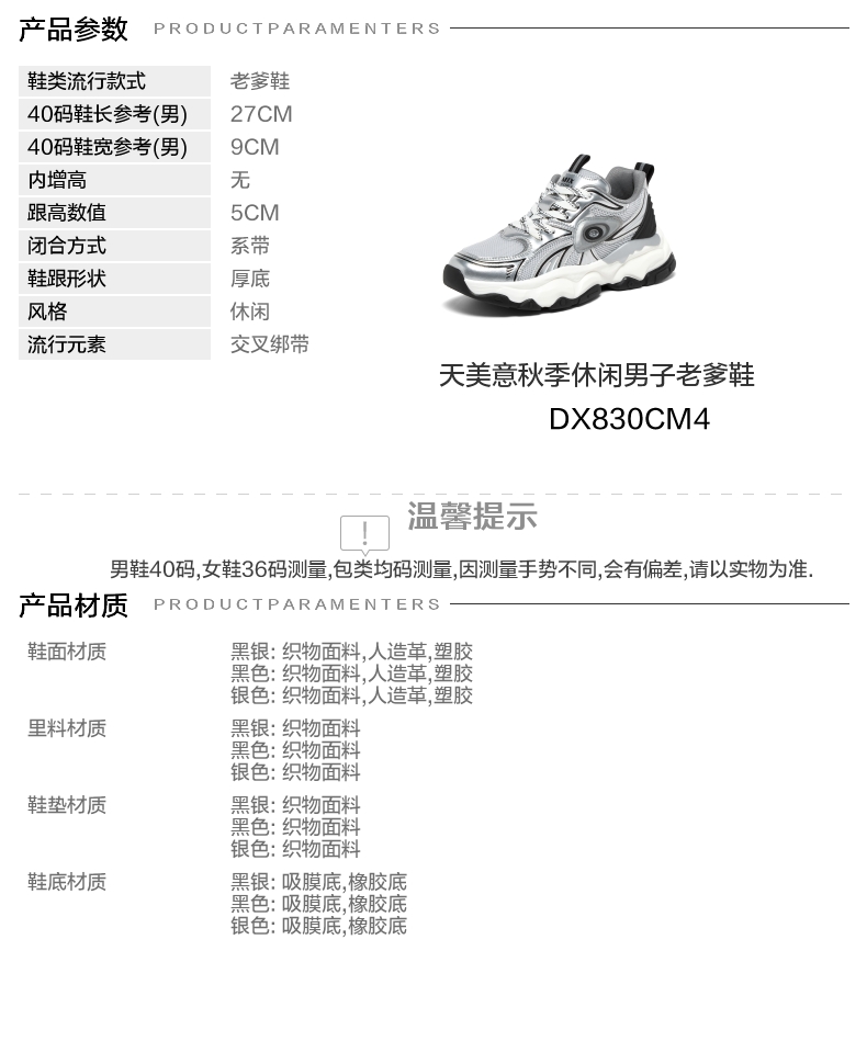 | 风格:休闲 | 色系:银色 | 跟高数值:5CM | 40码鞋宽参考(男):11.5CM | 性别:男子 |