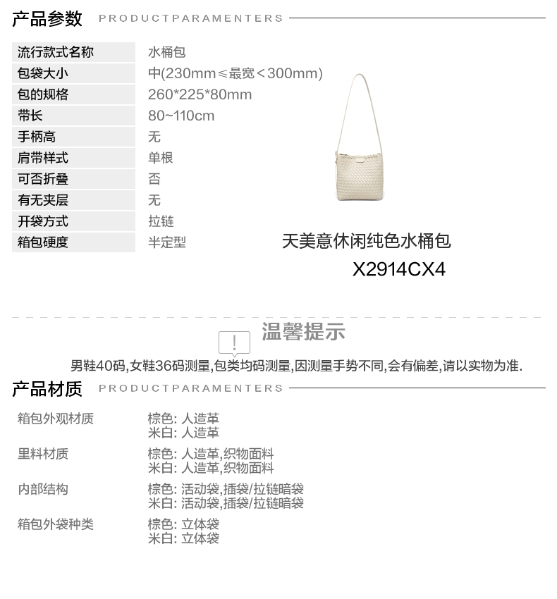 | 流行款式名称:水桶包 | 开袋方式:磁扣 | 性别:女 | 里料材质:织物面料人造革 | 手柄高:无 |