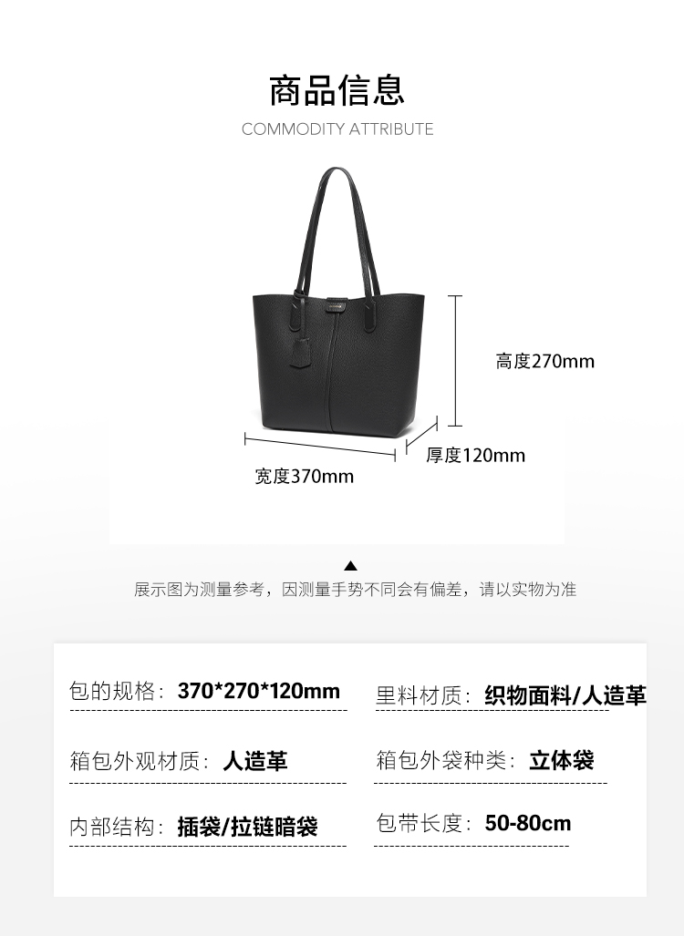 | 流行元素:纯色 | 包的规格:W370*H270*D120MM | 内部结构:插袋/拉链暗袋 | 背带方式:单肩 | 有无夹层:无 |