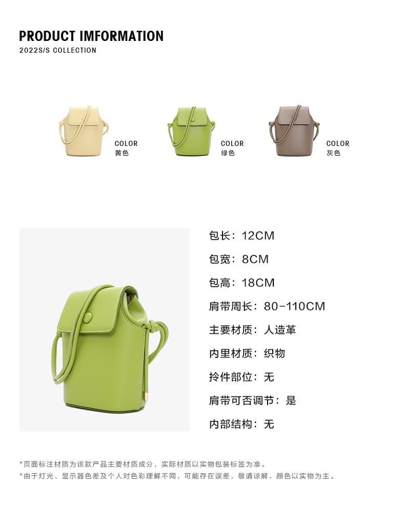| 可否折叠:否 | 包的规格:12*8*18CM | 闭合方式:包盖式 | 背带方式:斜挎 | 内部结构:无 |