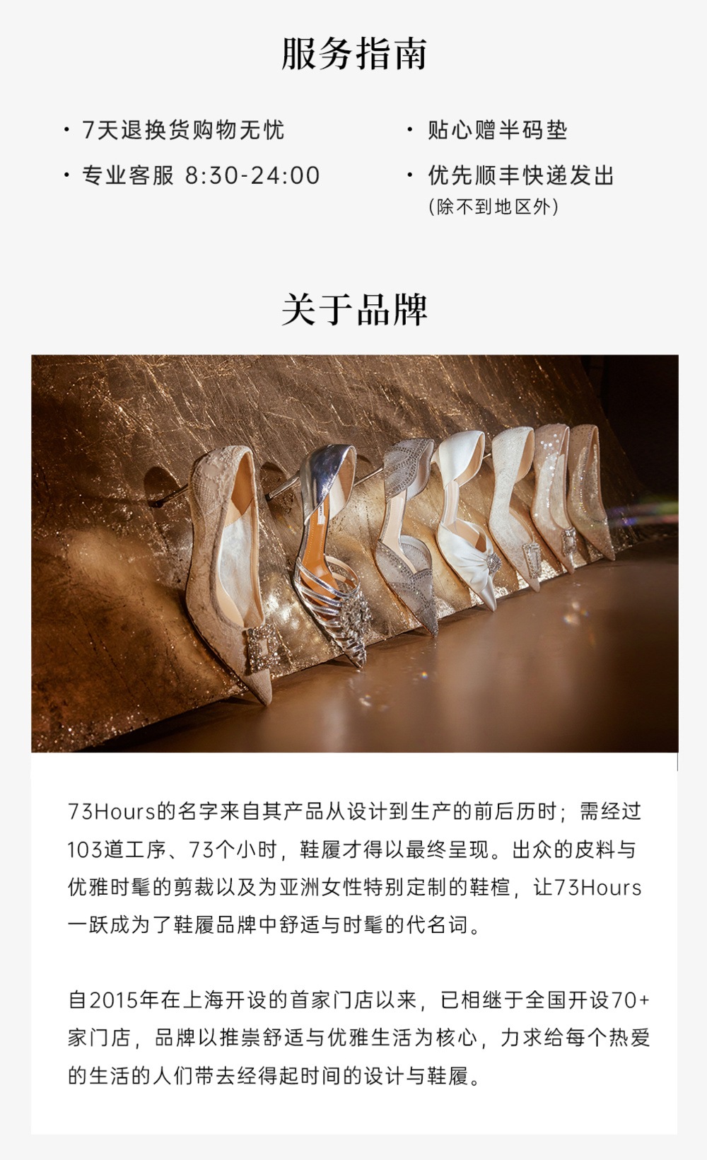 从设计到生产再到呈现于您的面前,73Hours的鞋履会经过103道工序,前后经历73.3小时,出众的皮料/优雅时髦的剪裁/为亚洲女性定制的鞋楦,让73Hours一跃成为鞋履品牌中,舒适与时髦的代名词,婚鞋系列更是73Hours的标志,是众多女明星结婚时的选择。