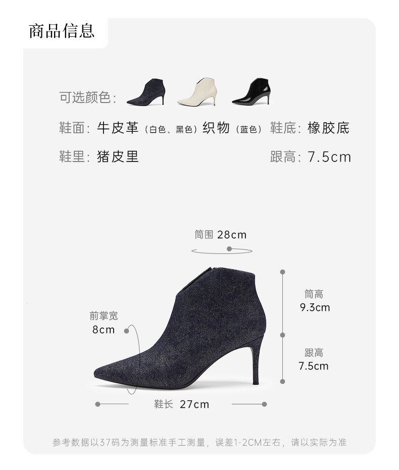 | 风格分类:时装靴 | 上市时间:2023年冬季 | 生产/经销/进口厂家: | 鞋类流行款式:短靴 | 鞋头款式:尖头 |