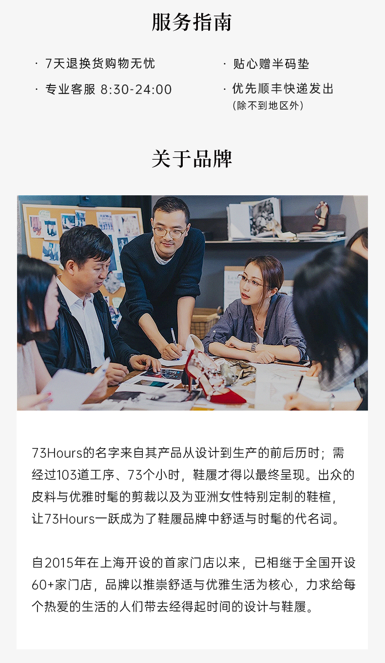 从设计到生产再到呈现于您的面前,73Hours的鞋履会经过103道工序,前后经历73.3小时,出众的皮料/优雅时髦的剪裁/为亚洲女性定制的鞋楦,让73Hours一跃成为鞋履品牌中,舒适与时髦的代名词,婚鞋系列更是73Hours的标志,是众多女明星结婚时的选择。