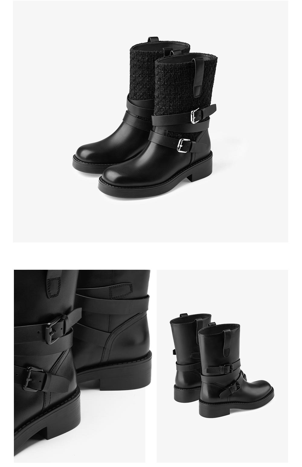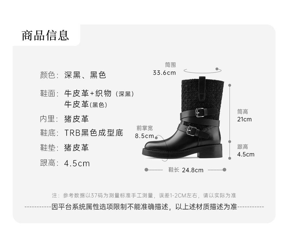 | 鞋头款式:圆头 | 鞋底材质:橡胶底 | 鞋面图案:纯色 | 靴筒内里材质:猪皮革 | 内增高:无 |