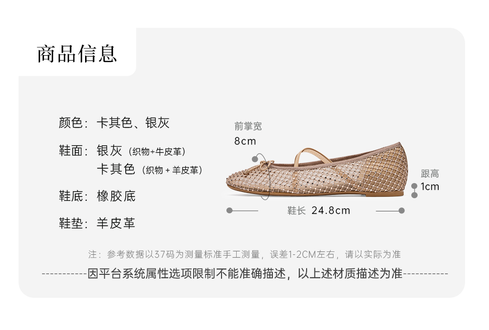 | 所在区域:电子商务 | 配跟:无 | 开口深度:浅口 | 风格分类:芭蕾舞鞋 | 上市时间:2025年春季 |