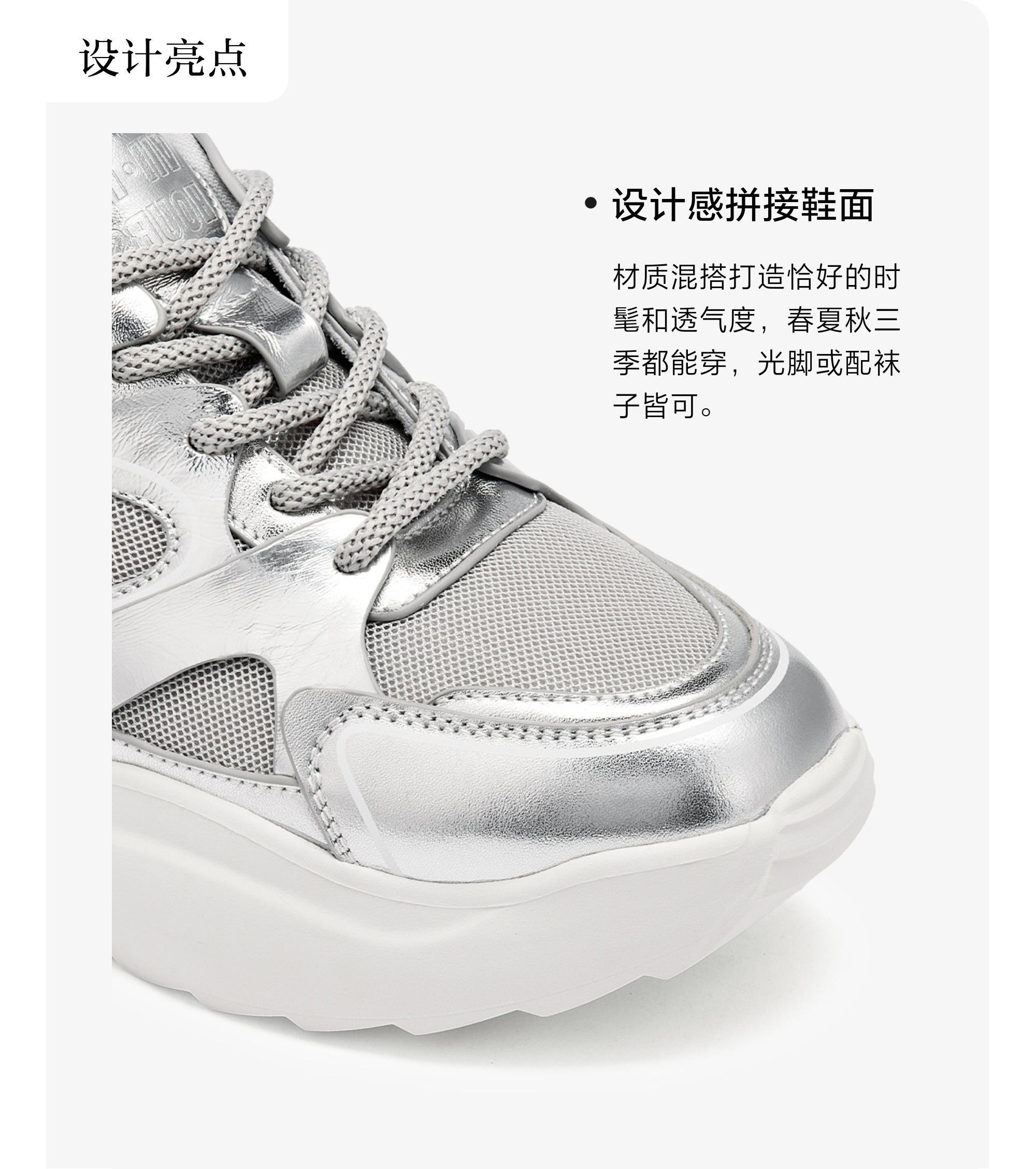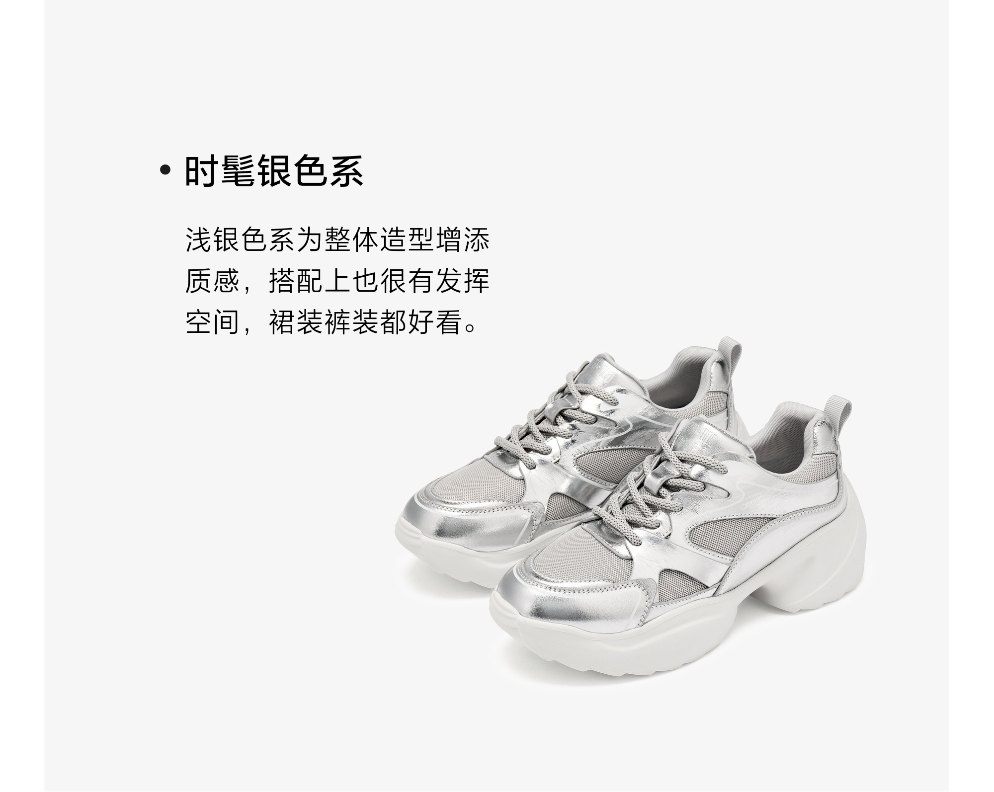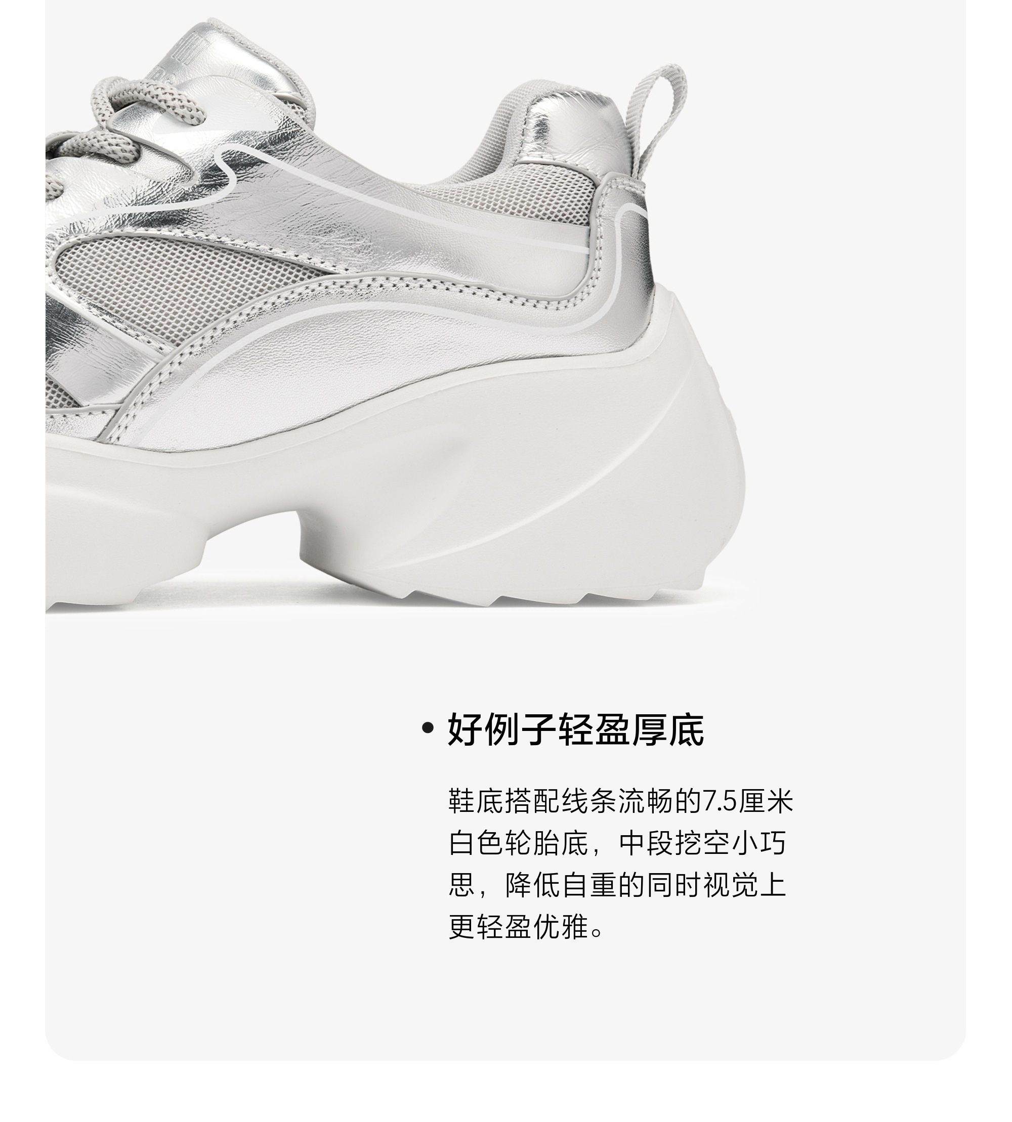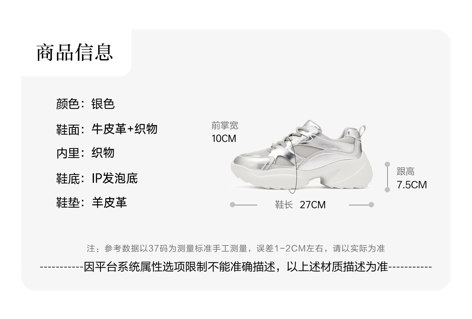 | 闭合方式:系带 | 风格:休闲 | 跟高数值:7.5CM | 色系:银色 | 配跟:无 |