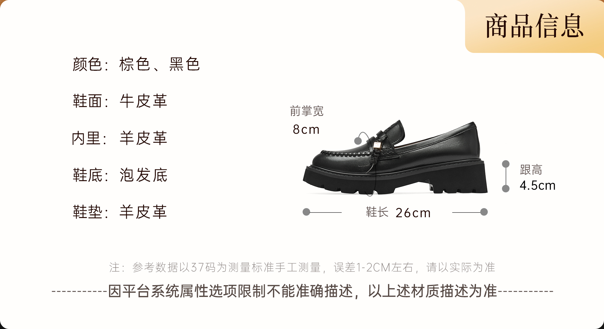 | 皮质特征:牛皮革 | 前掌高度:无 | 防水台高度:无 | 鞋类流行款式:乐福鞋 |