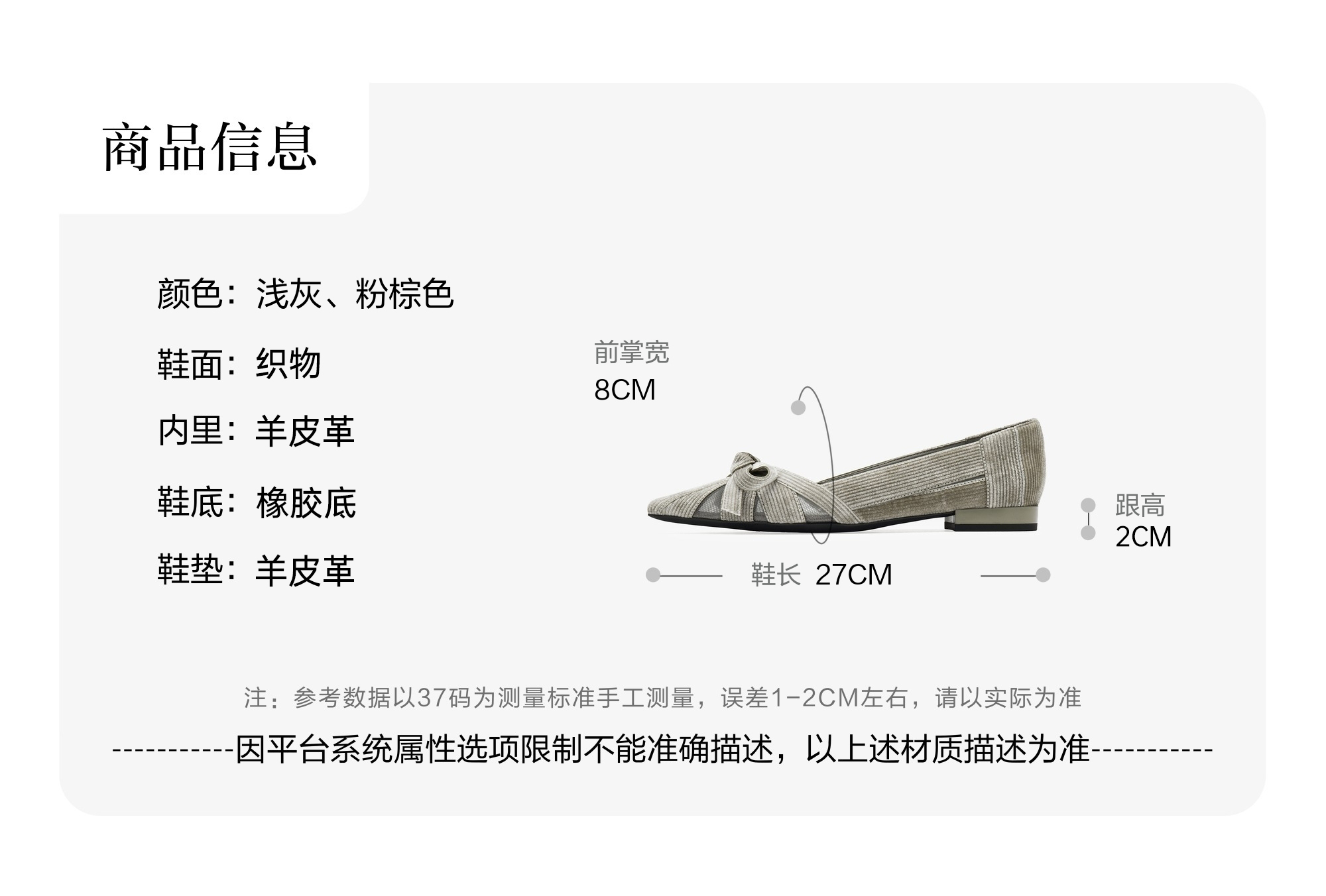 | 风格:休闲 | 跟高数值:2CM | 色系:灰色 | 配跟:无 | 性别:女子 |