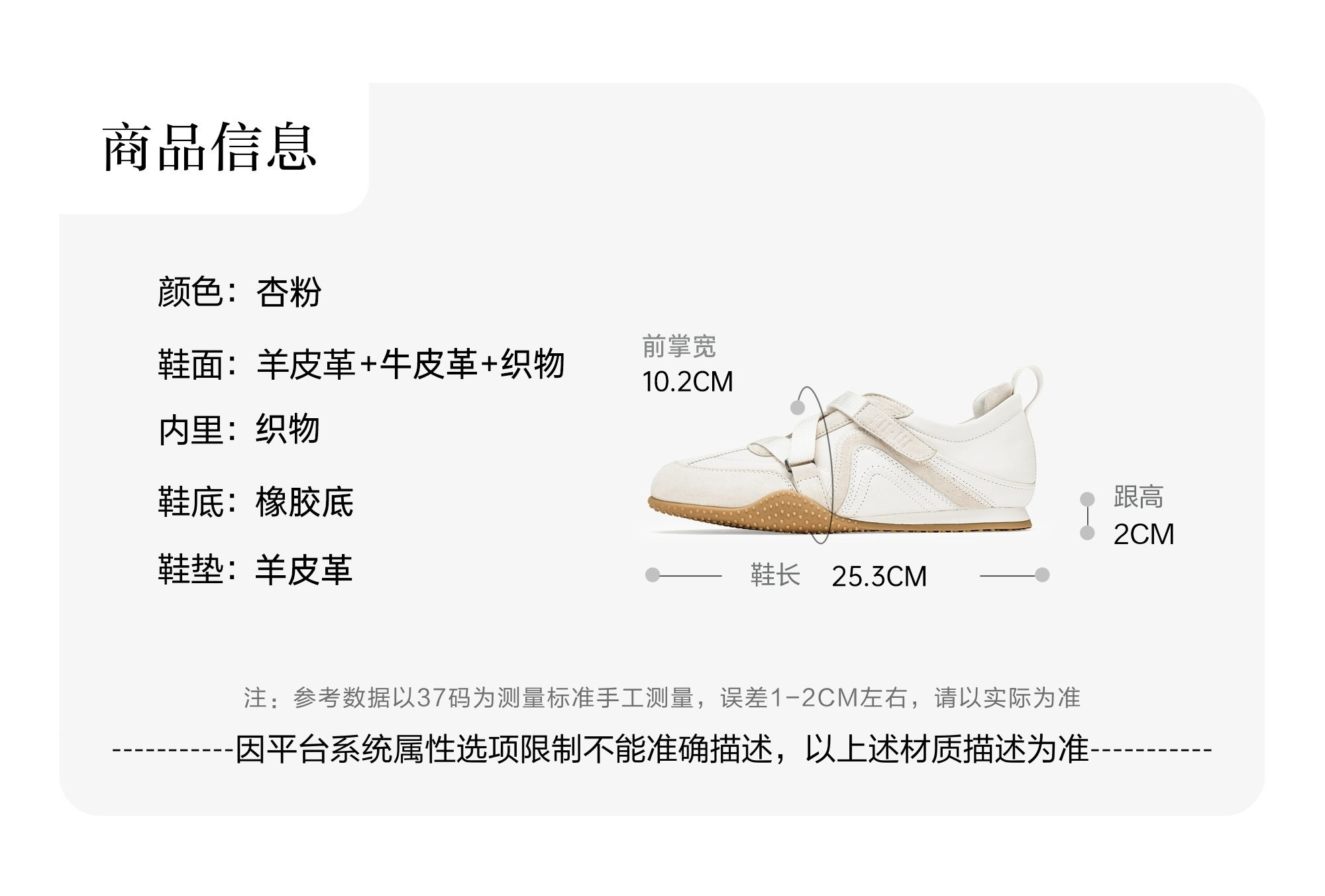 | 鞋面材质:羊皮革 | 流行元素:纯色 | 参考鞋长(女):25.5CM | 参考鞋宽(女):10CM | 闭合方式:魔术贴 |