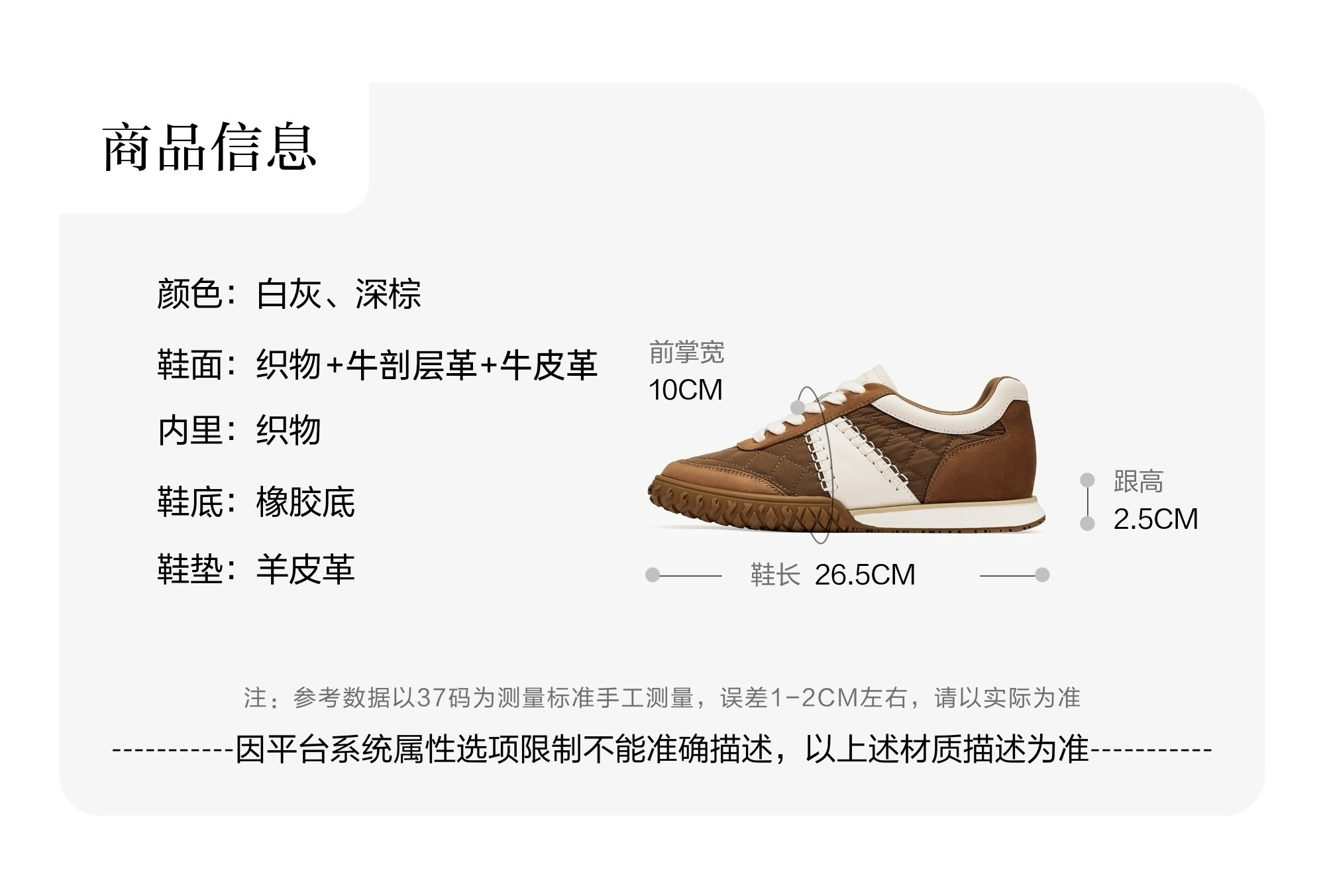 | 鞋跟形状:平跟 | 鞋面材质:织物牛皮革牛剖层革 | 流行元素:纯色 | 参考鞋长(女):26.5CM | 参考鞋宽(女):10CM |