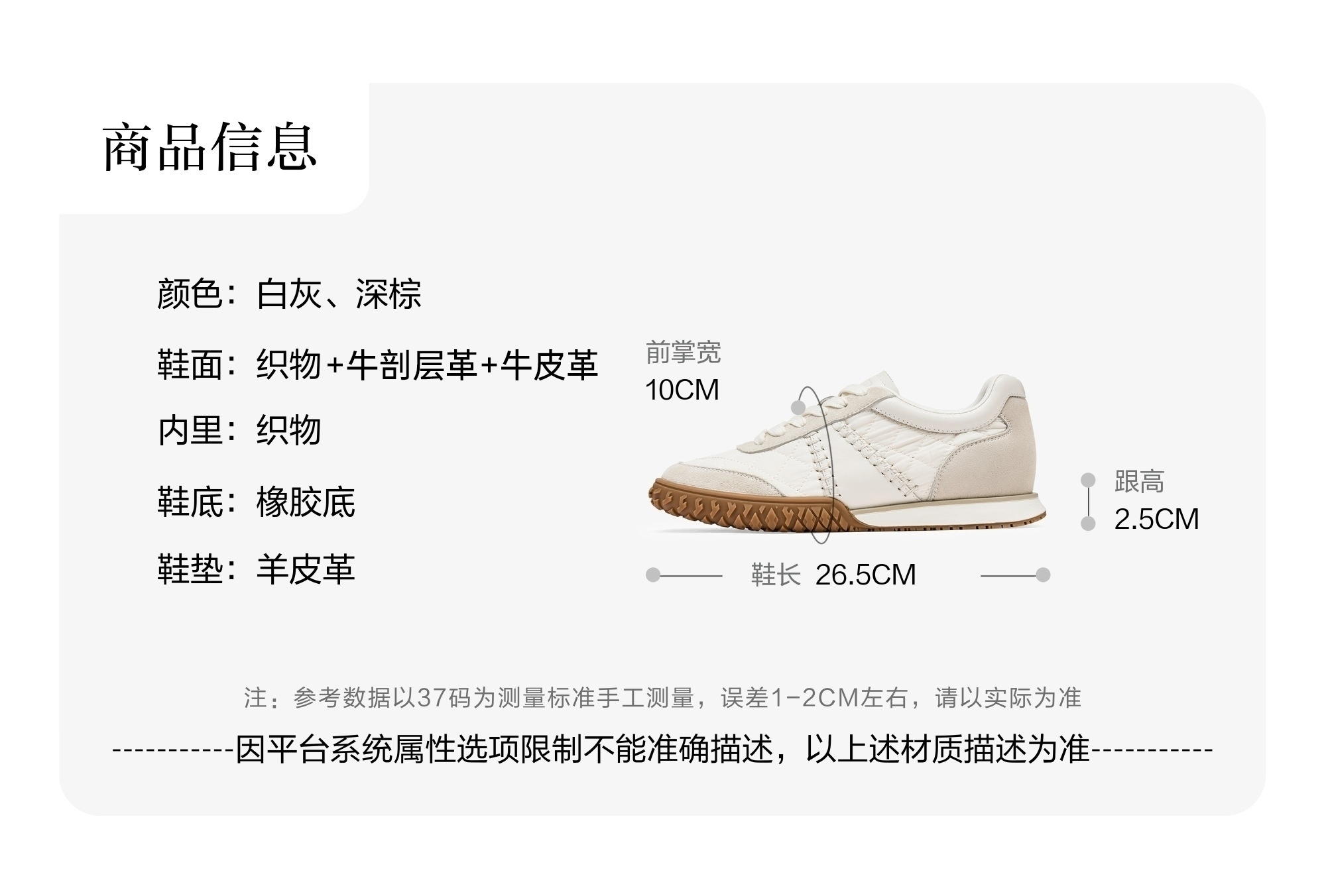 | 鞋跟形状:平跟 | 鞋面材质:牛皮革织物牛剖层革 | 流行元素:纯色 | 参考鞋长(女):26.5CM | 参考鞋宽(女):10CM |