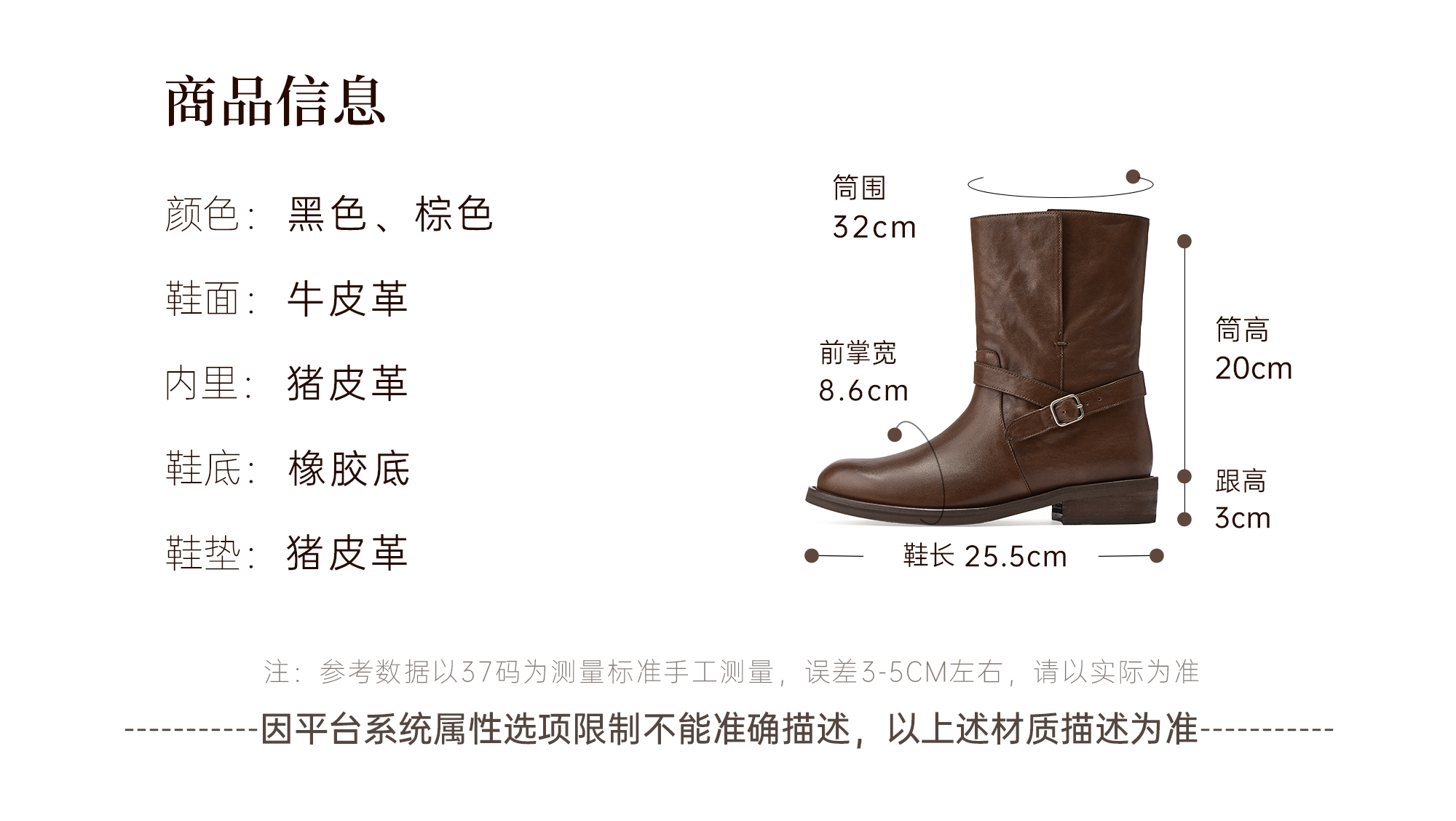 | 筒高数值:20CM | 性别:女子 | 靴筒筒面材质:牛皮革 | 里料材质:猪皮革 | 鞋垫材质:猪皮革 |