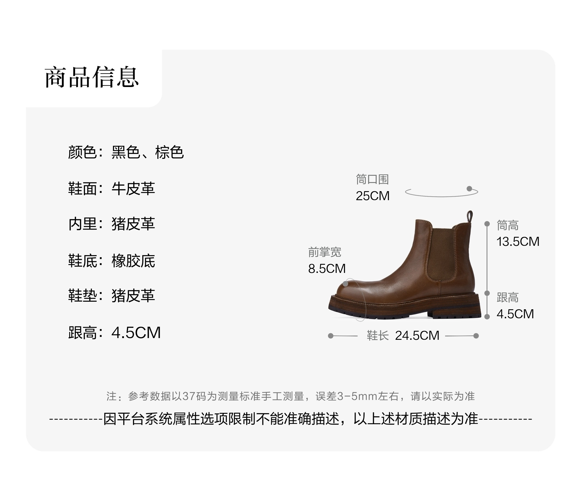 | 筒高数值:13.5CM | 性别:女子 | 靴筒筒面材质:牛皮革 | 里料材质:猪皮革 | 鞋垫材质:猪皮革 |