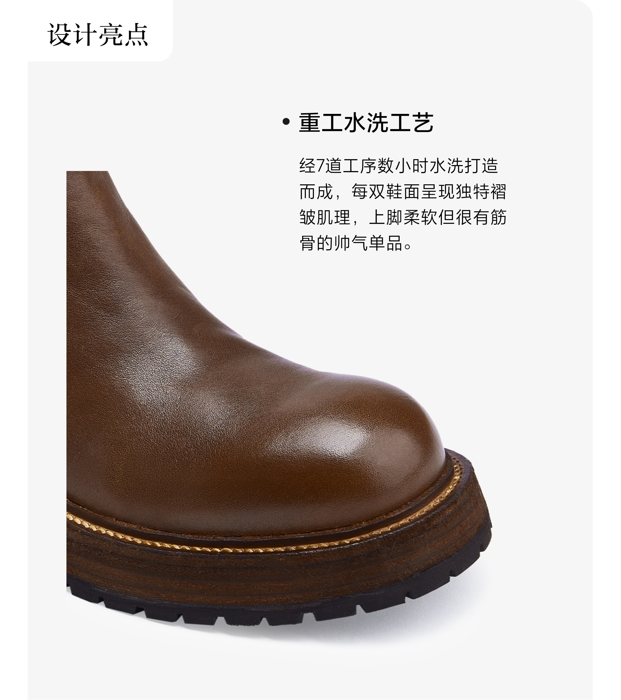 | 鞋底材质:橡胶底 | 靴筒内里材质:猪皮革 | 内增高:无 | 鞋面材质:牛皮革 | 闭合方式:套脚 |