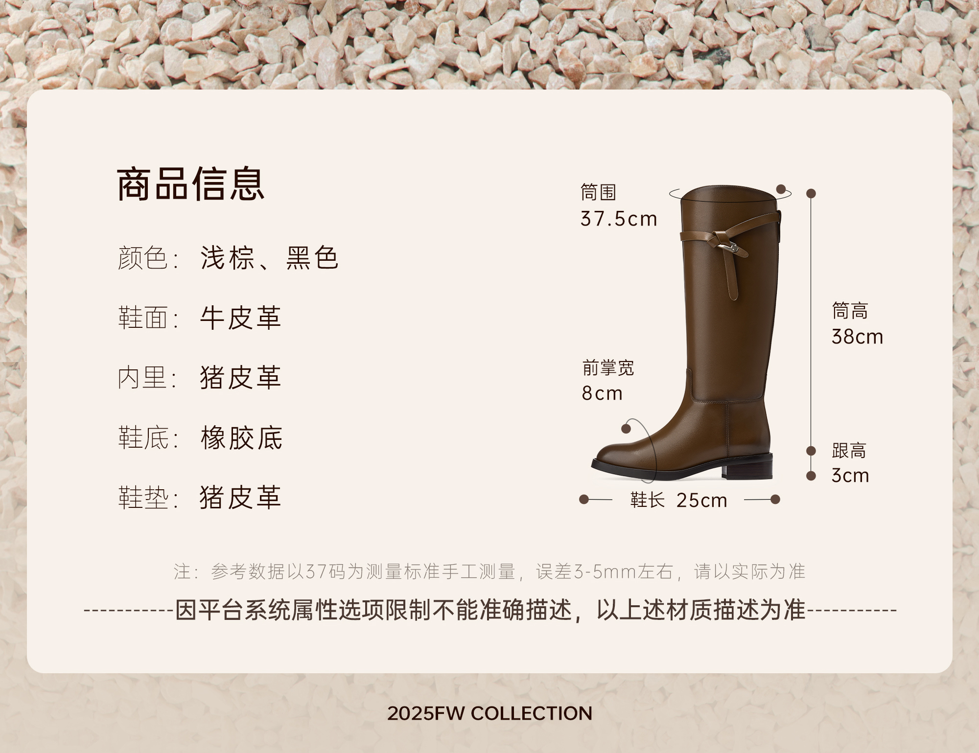 | 配跟:无 | 靴筒口围:37.5CM | 上市时间:2025年冬季 | 鞋类流行款式:骑士靴 | 鞋头款式:圆头 |