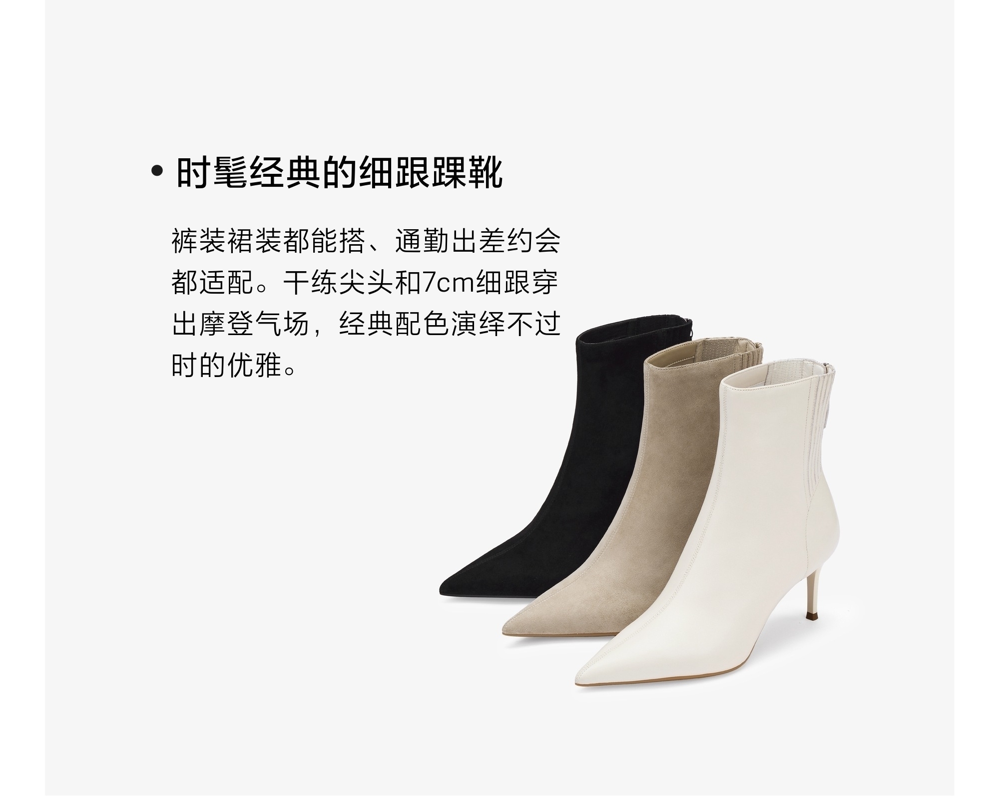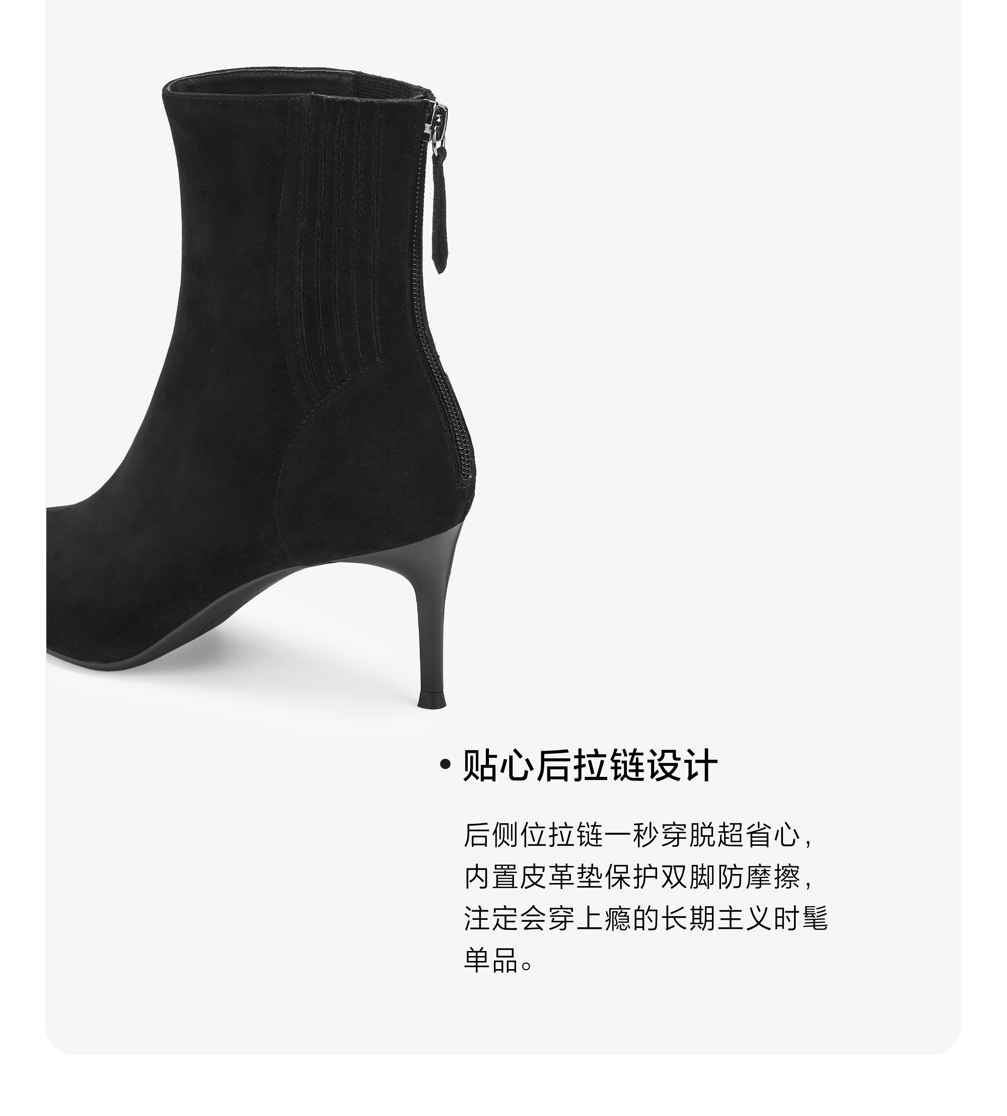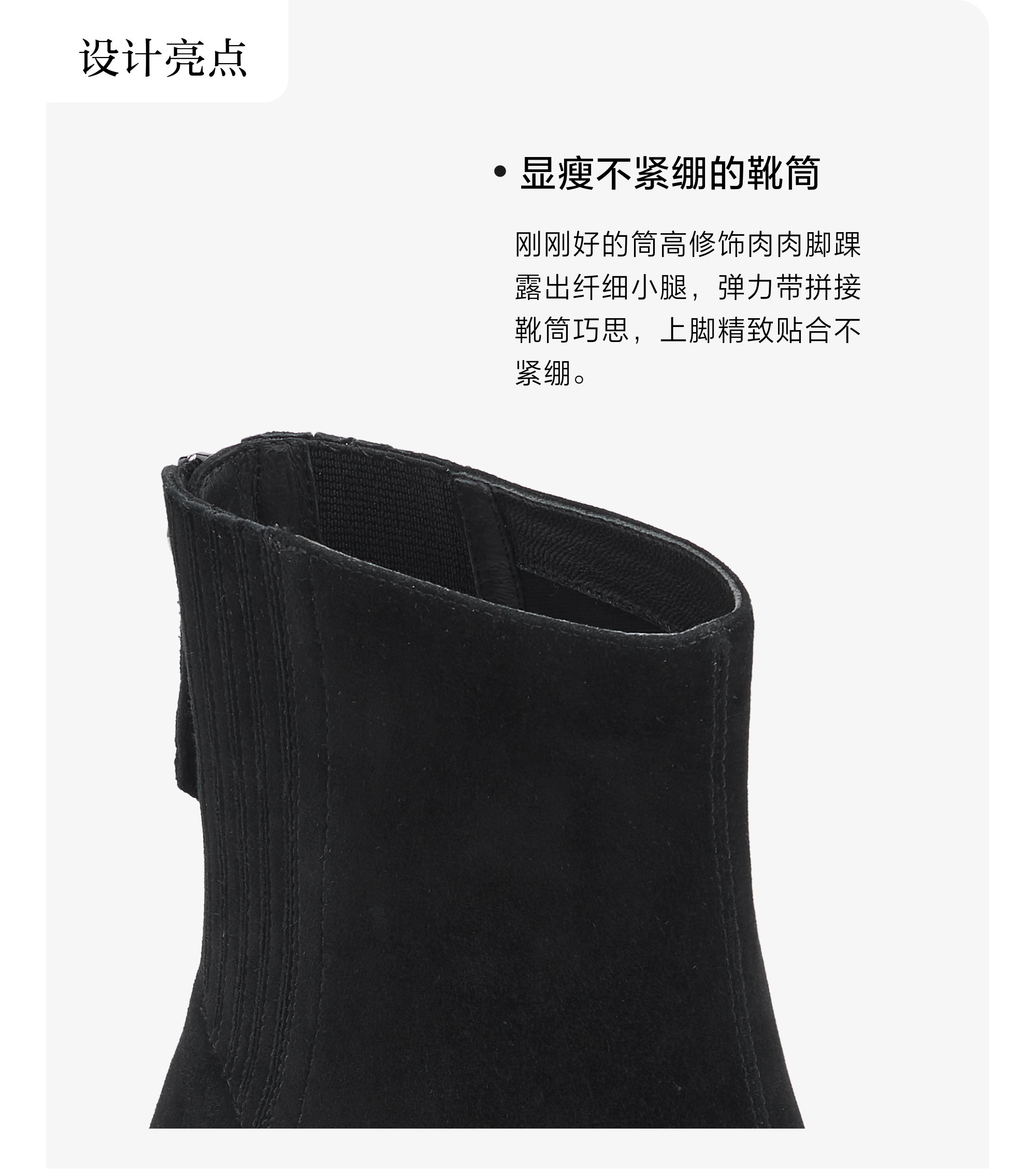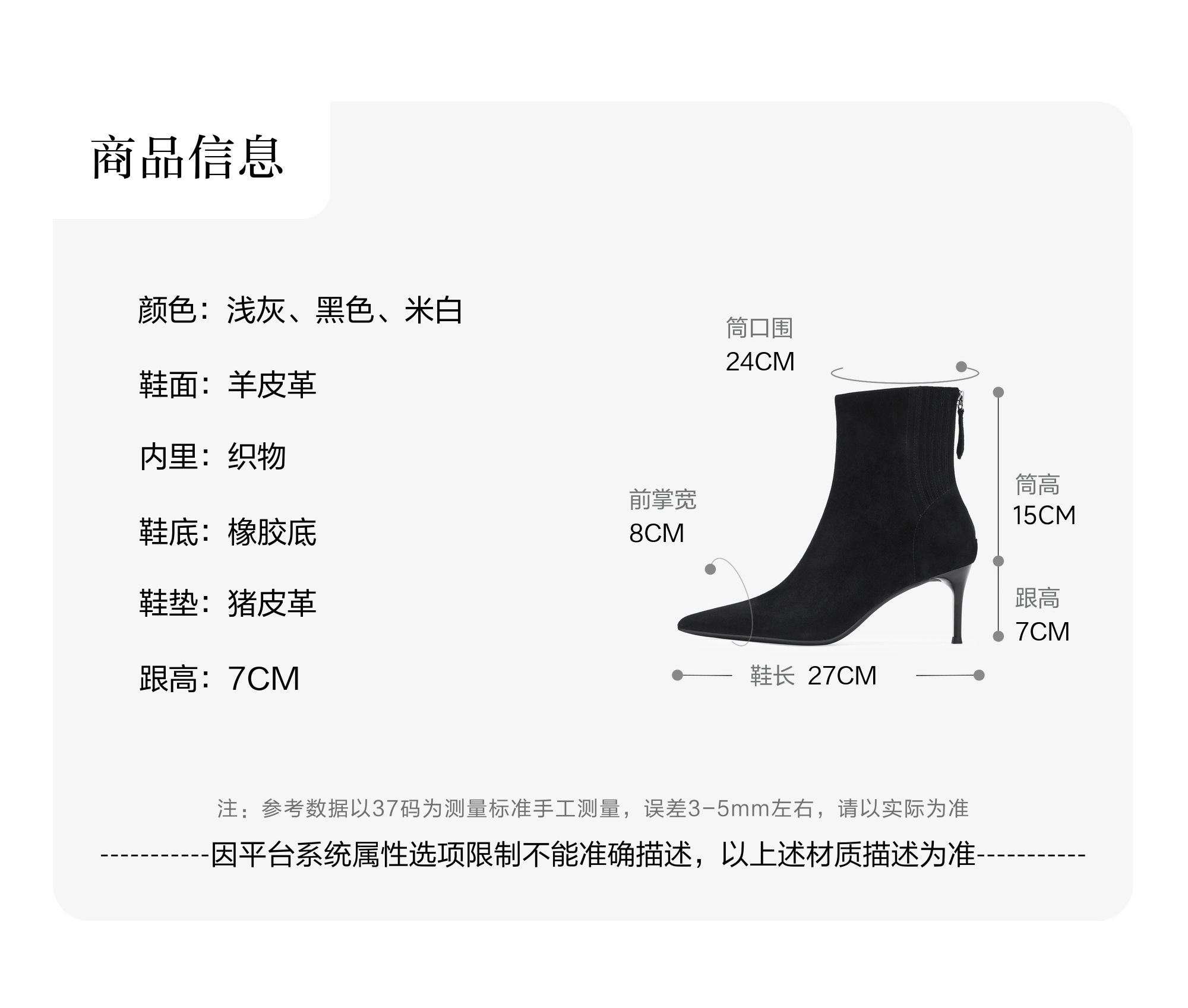 | 鞋底材质:橡胶底 | 靴筒内里材质:猪皮革 | 内增高:无 | 鞋面材质:羊皮革 | 闭合方式:后拉链 |