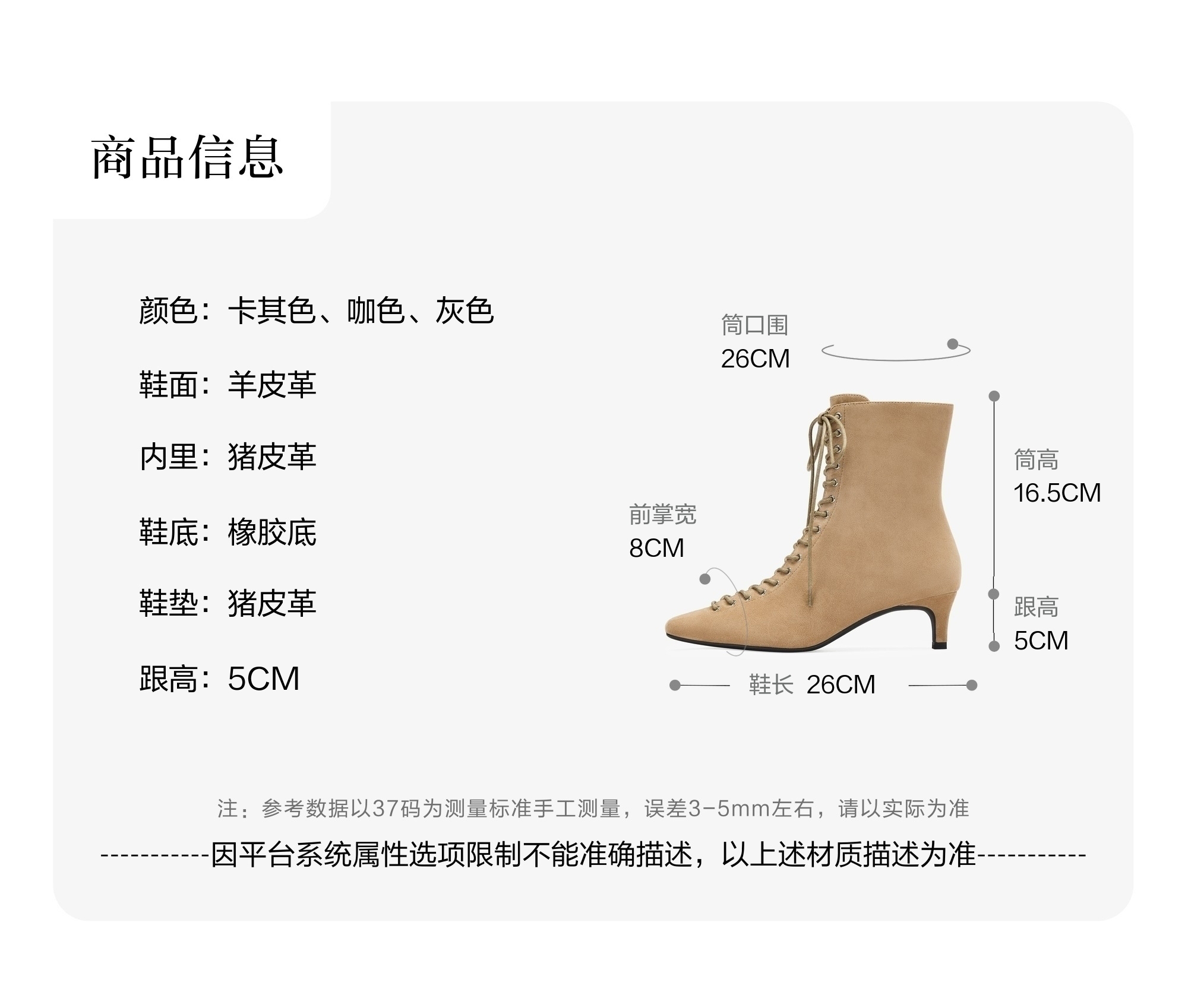 | 筒高数值:16.5CM | 性别:女子 | 靴筒筒面材质:羊皮革 | 里料材质:猪皮革 | 鞋垫材质:猪皮革 |