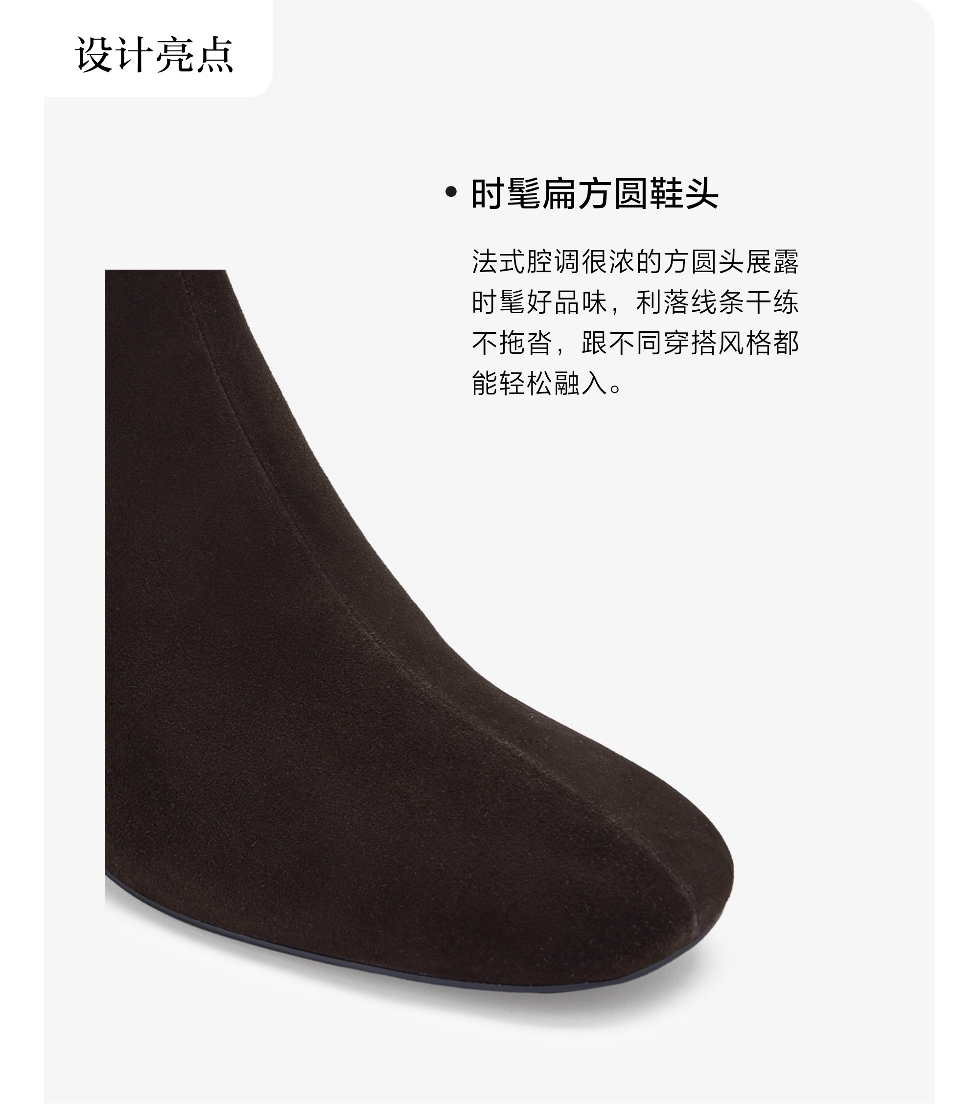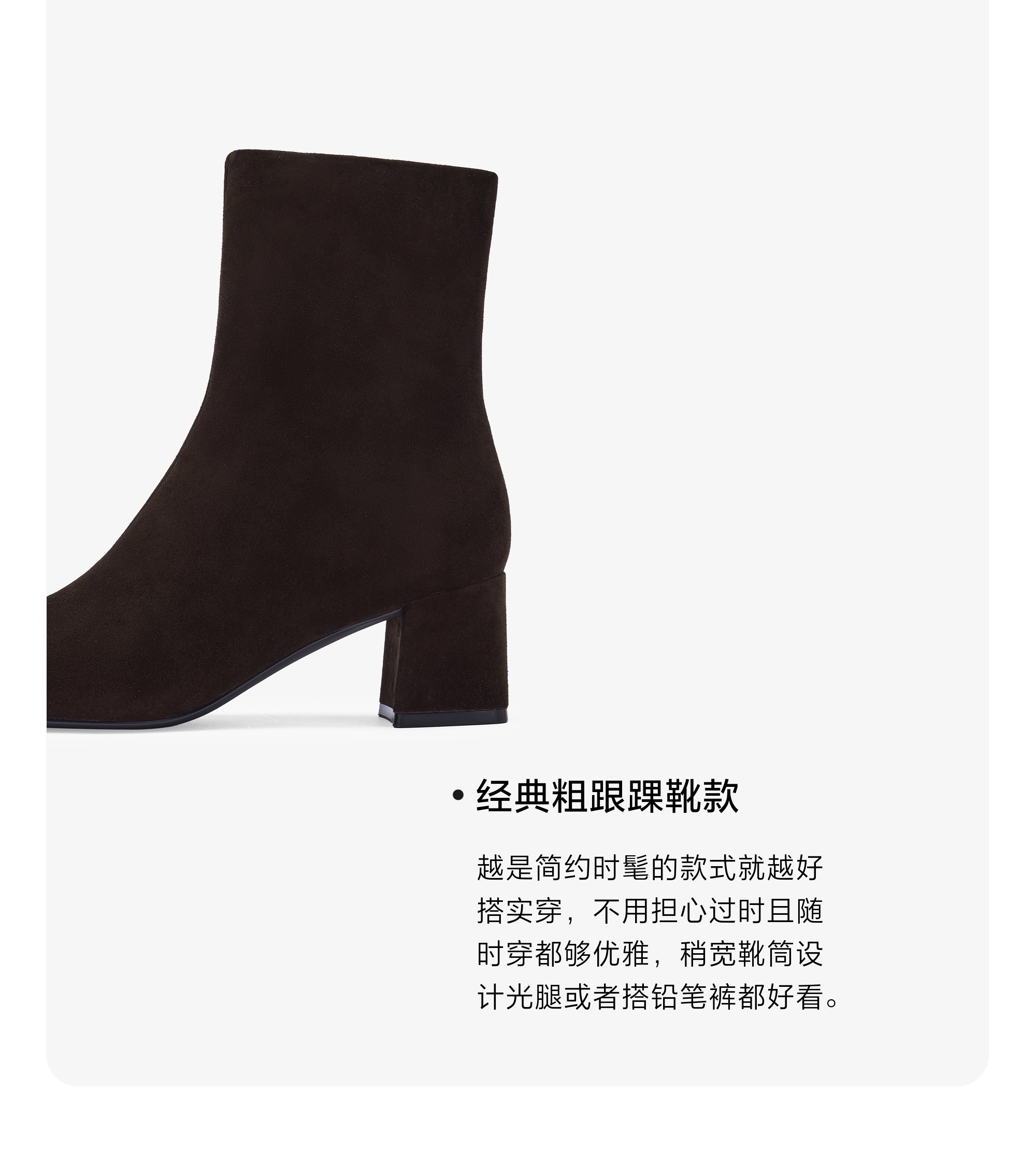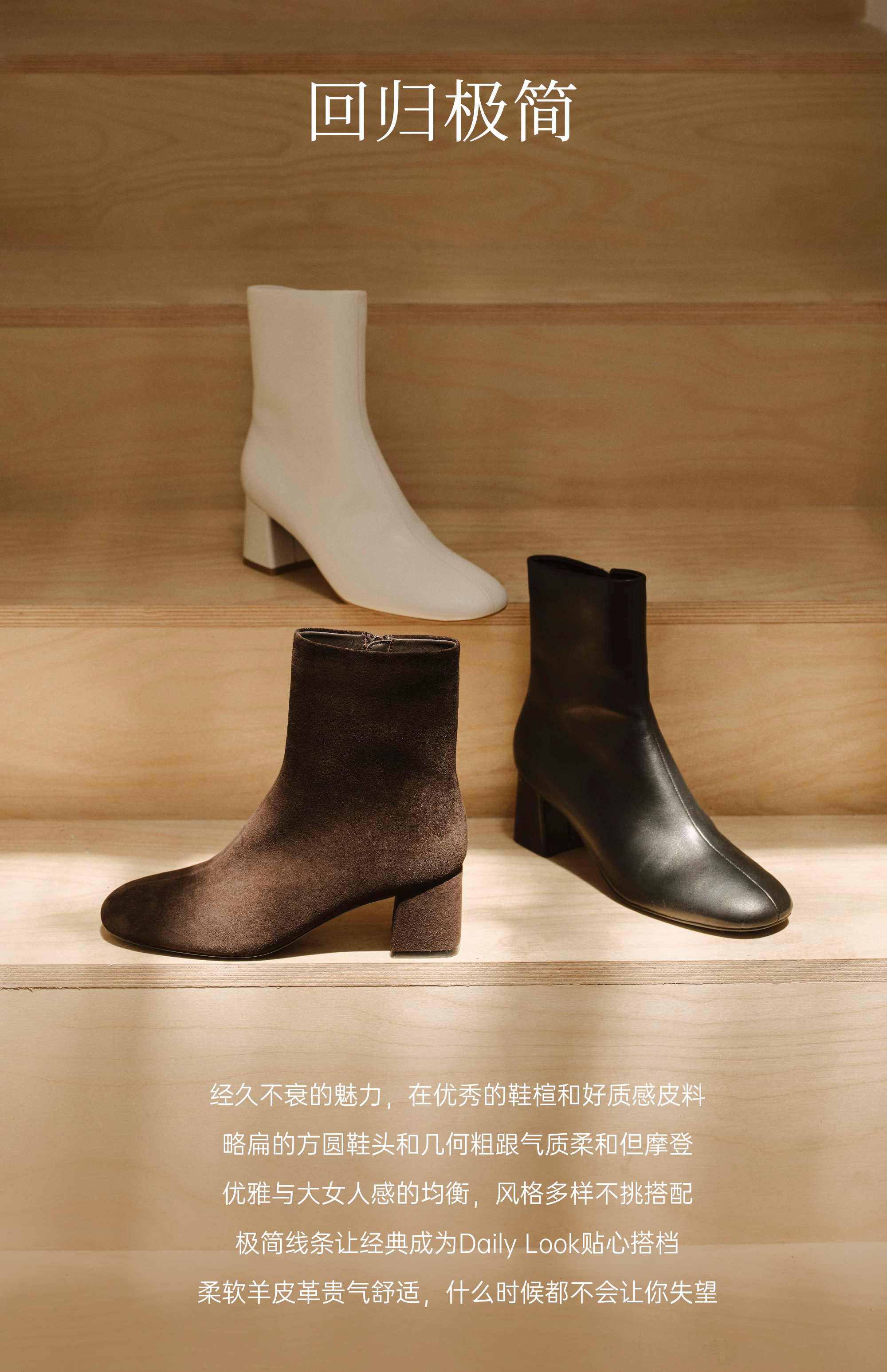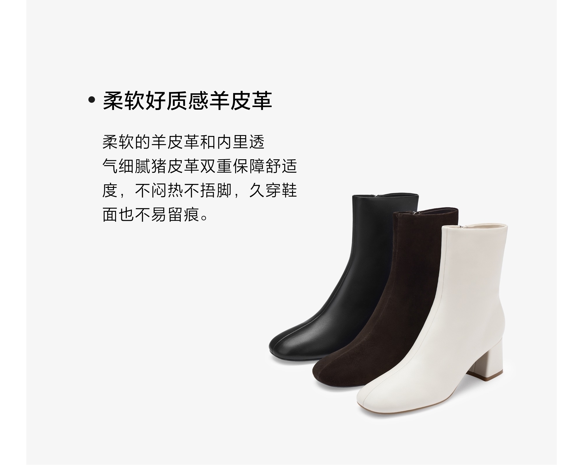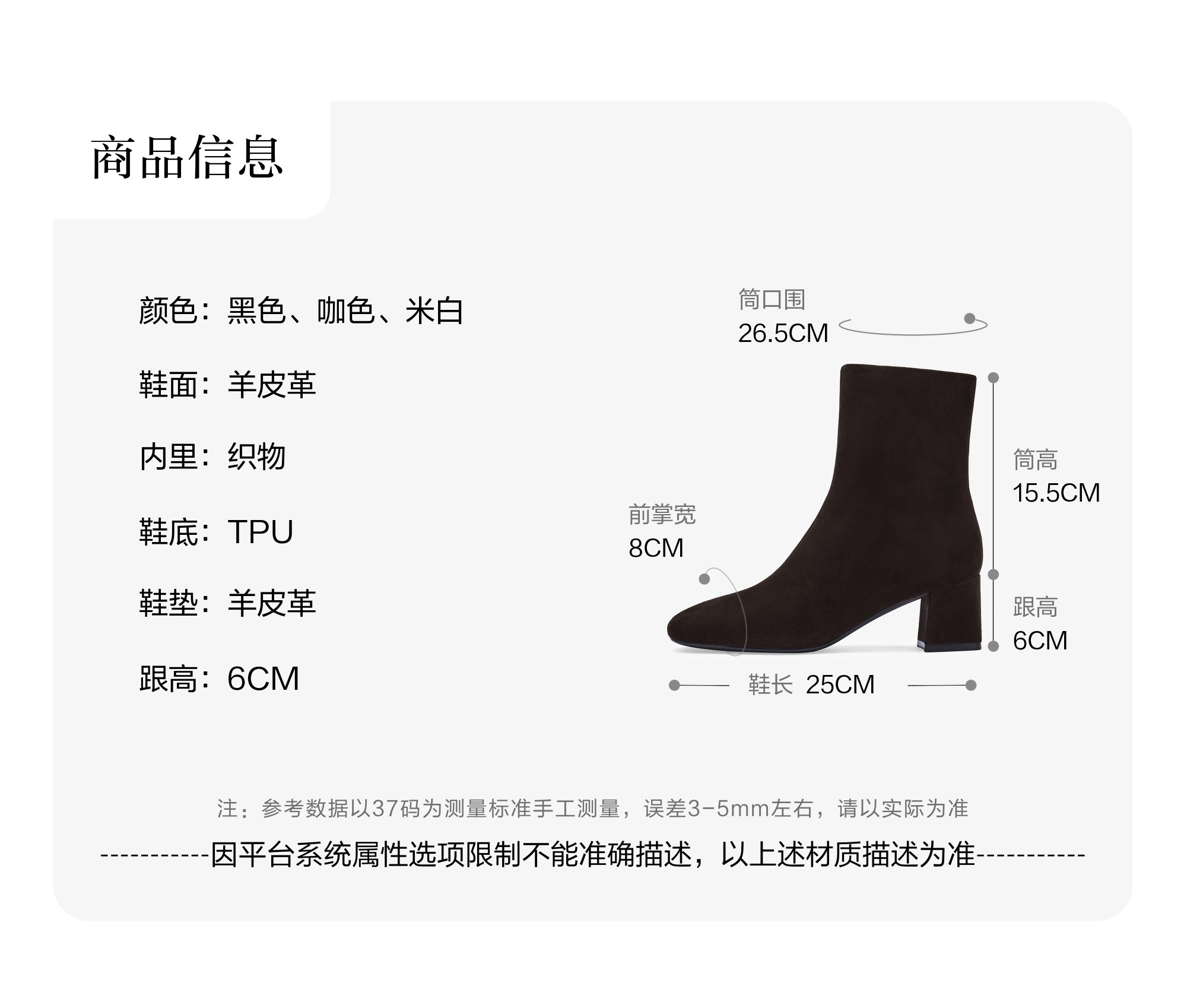 | 鞋底材质:TPU | 靴筒内里材质:织物 | 内增高:无 | 鞋面材质:羊皮革 | 闭合方式:侧拉链 |