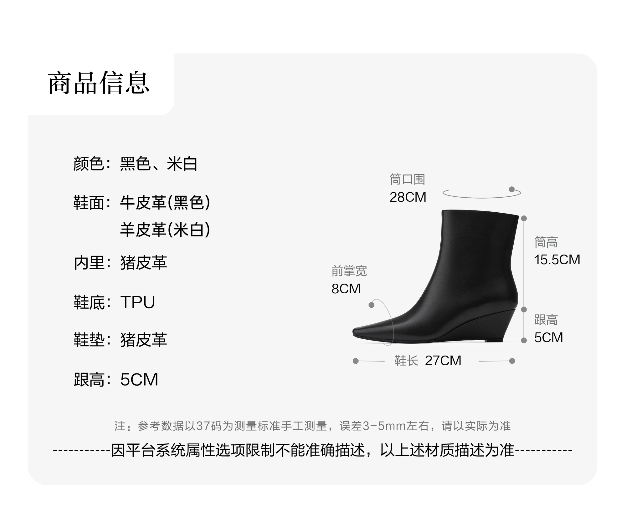 | 筒高数值:15.5CM | 性别:女子 | 靴筒筒面材质:牛皮革 | 里料材质:猪皮革 | 鞋垫材质:猪皮革 |