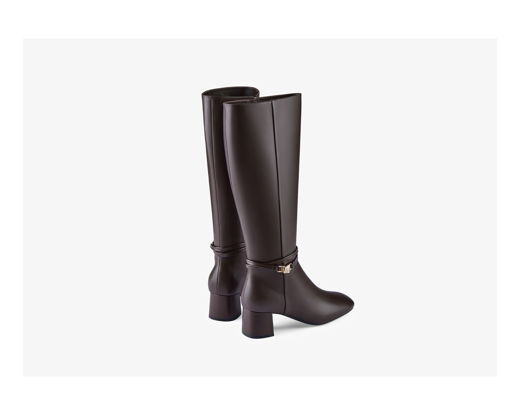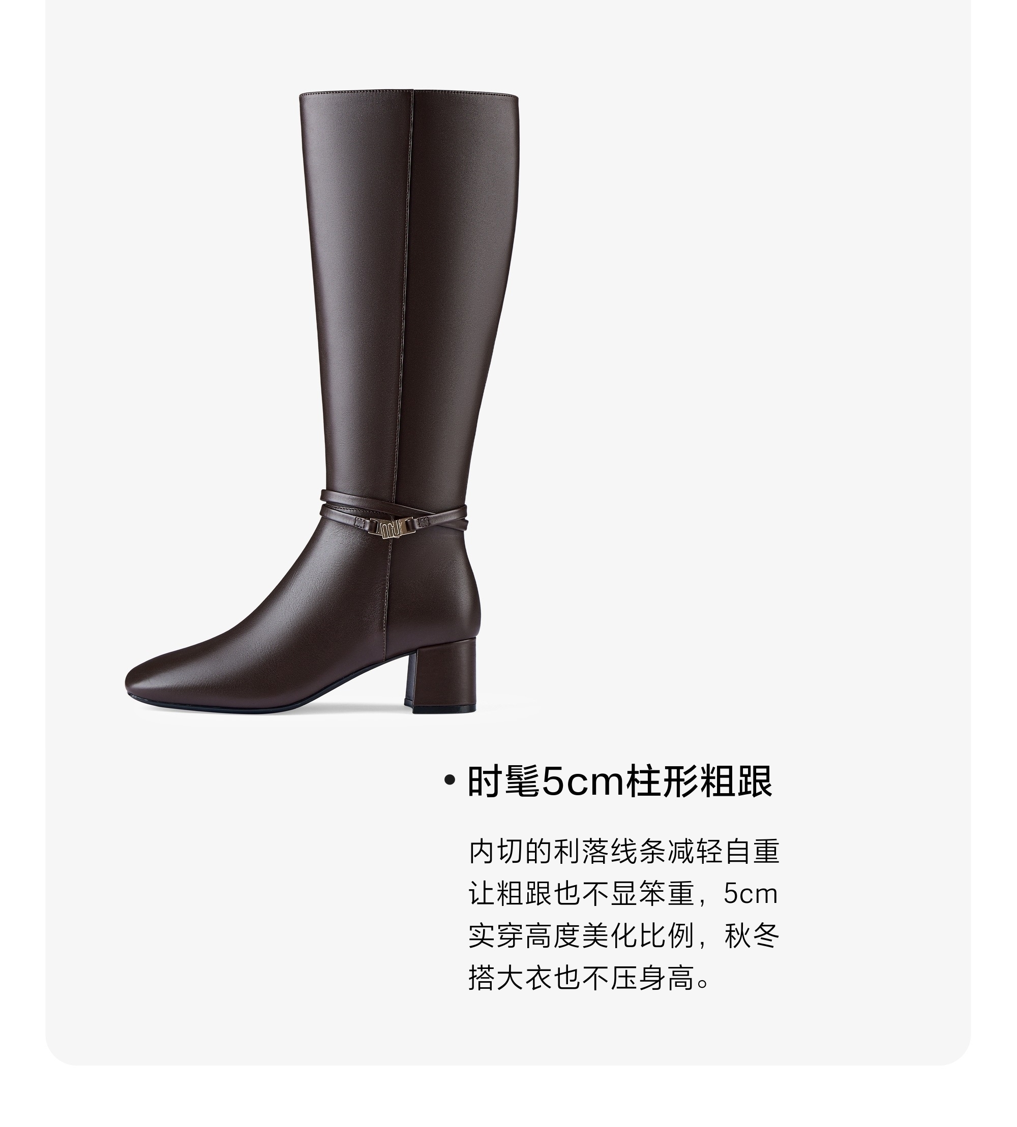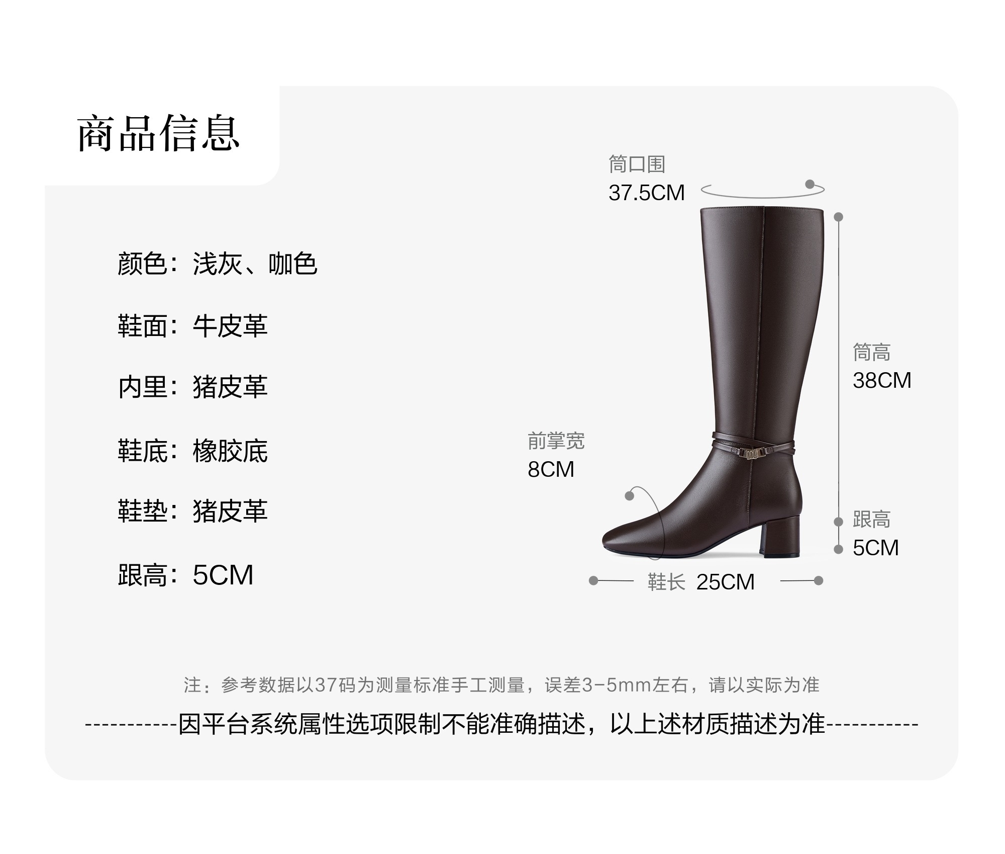 | 风格:休闲 | 鞋面内里材质:猪皮革 | 色系:咖啡色 | 跟高数值:5CM | 筒高数值:38CM |