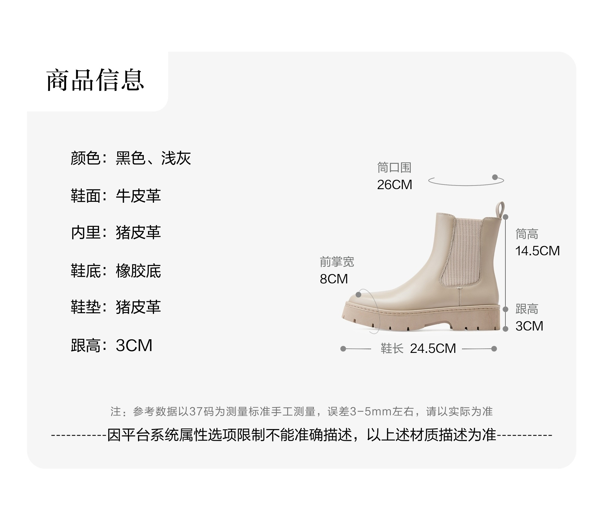 | 帮面材质:牛皮革 | 配跟:无 | 靴筒口围:26CM | 上市时间:2025年冬季 | 鞋类流行款式:切尔西靴 |