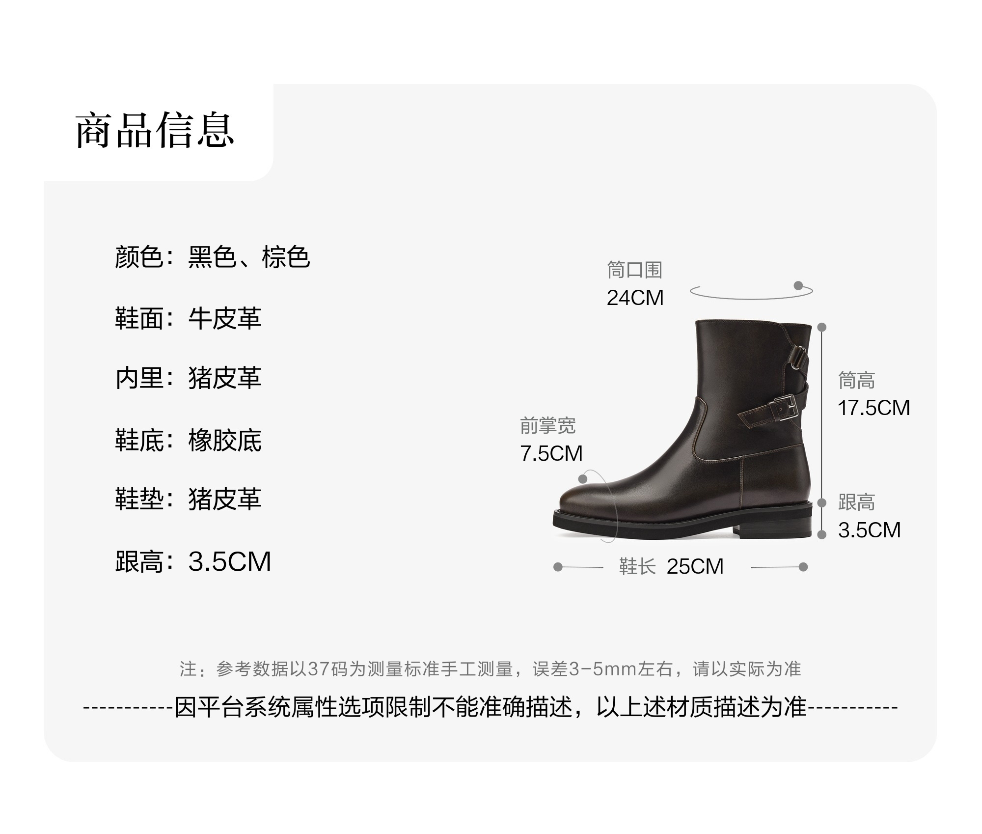 | 筒高数值:17.5CM | 性别:女子 | 靴筒筒面材质:牛皮革 | 里料材质:猪皮革 | 鞋垫材质:猪皮革 |